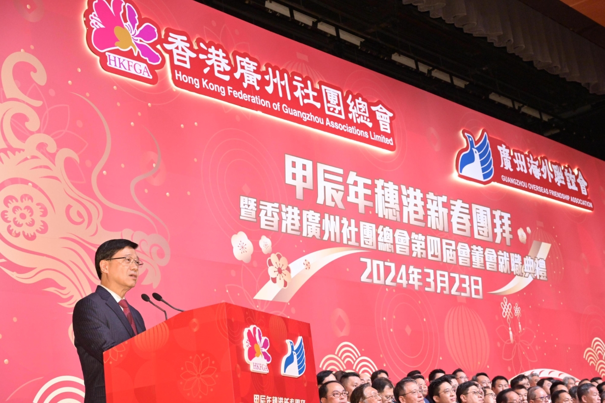 行政長官李家超今日(三月二十三日)在甲辰年穗港新春團拜暨香港廣州社團總會第四屆會董會就職典禮上致辭 李家超說,香港和廣州地緣相近,關係密切,兩地都是粵港澳大灣區的中心城市,一直聯手推動區域發展。特區政府積極帶領香港各界貢獻大灣區高質量發展,與廣州和大灣區城市緊密合作,優勢互補,互惠共贏。 他指出,今日對香港有特別意義,是一個有歷史意義的日子,是令香港社會感到驕傲和鼓舞的日子。今日,《維護國家安全條例》刊憲生效,香港特區完成了基本法第23條本地立法的憲制責任和歷史使命,更有效保障國家安全。今後,香港特區可以輕裝上陣,全神貫注發展經濟、改善民生。 李家超強調,政府將繼續推動提升香港與內地和國際的互聯互通,主動積極融入國家發展大局,同時鞏固和提升香港的國際競爭力,為香港特區的璀璨未來譜寫新篇章。(完) 【編輯:馬華】