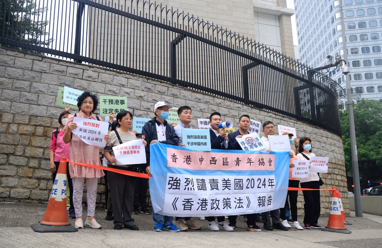 香港新聞網4月1日電(記者 曹文毓)美國國務院日前發布所謂“2024年香港政策法報告”,詆毀香港法治等。4月1日,保衛香港運動、香港中西區青年協會等多個市民團體前往美國駐港澳總領事館外抗議,譴責美國抹黑香港,粗暴干涉香港事務。