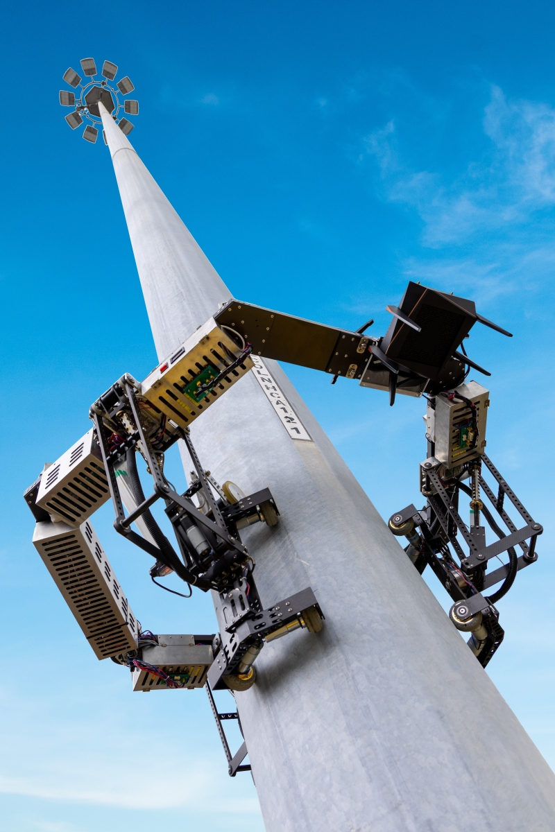 “攀影蜘蛛”能夠從地面爬上高達三十五米的高桿燈進行檢測,運用360度攝像機檢查及記錄高桿燈的鏽蝕狀況。工程師可以在地面進行檢查,分析結果將顯示在中央監控系統中。另外,“攀影蜘蛛”具有雙重保險設計,若空中無線網絡連接强度不足,機械人無法接收到工程師地面的指令,機械人設有後備傳輸系統,可以順利返回地面。目前,生產力局正在積極研發“攀影蜘蛛2.0”,在第一代“攀影蜘蛛”的基礎上開發人工智能系統,用於判定高桿燈的生鏽情況並進行自動評分。照片及影片經過處理後將形成全景圖,揭示高桿燈的完整生鏽情況,分析將包括具體鏽蝕尺寸和鏽蝕面積百分比,令業界可以根據不同生鏽程度采取相應維護措施。