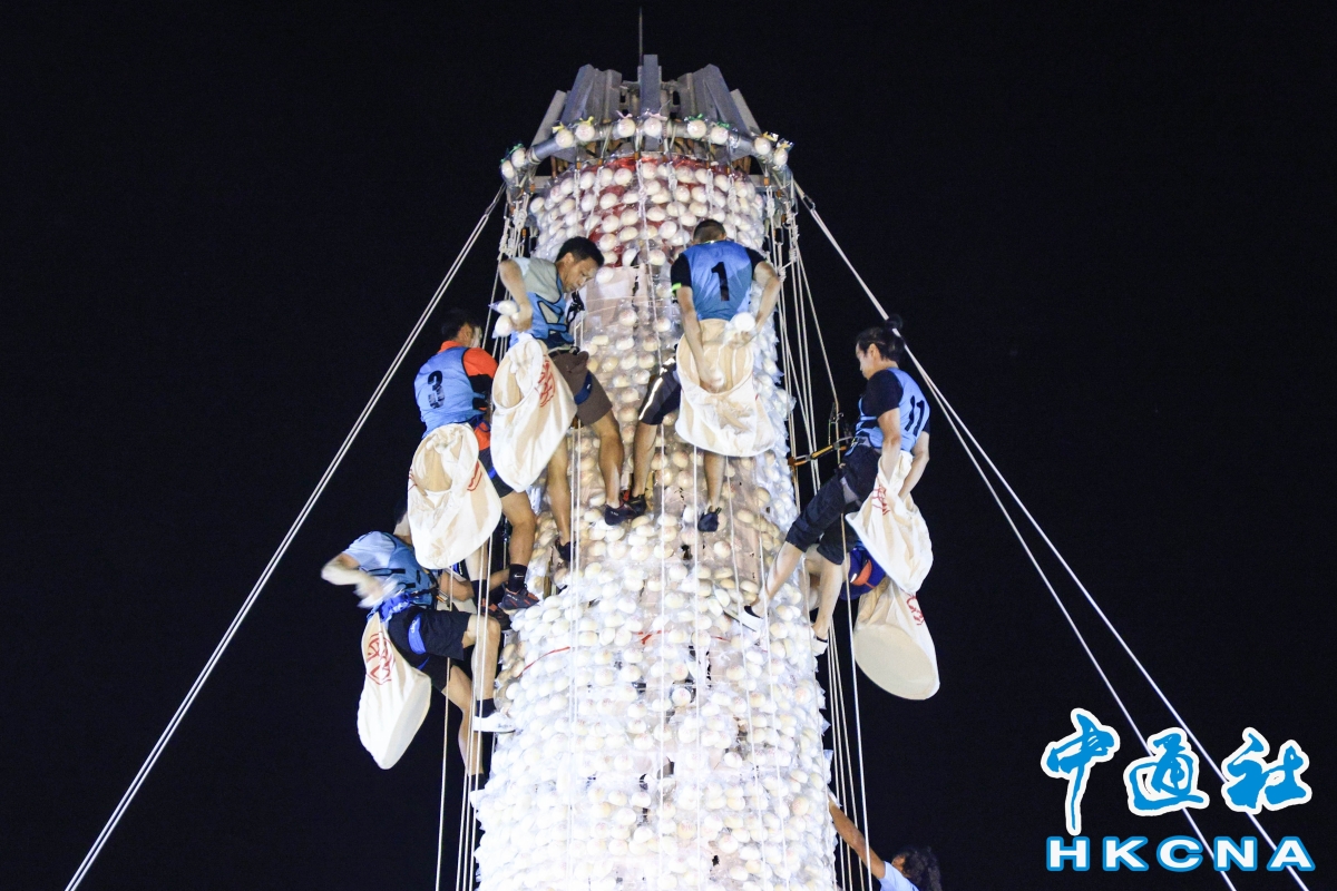香港新聞網5月16日電 香港長洲太平清醮的壓軸活動“搶包山”比賽16日凌晨舉行。在現場觀眾的歡呼聲中,9男3女在限定時間內爬上14米高的包山摘平安包,競逐“包山王”、“包山后”。