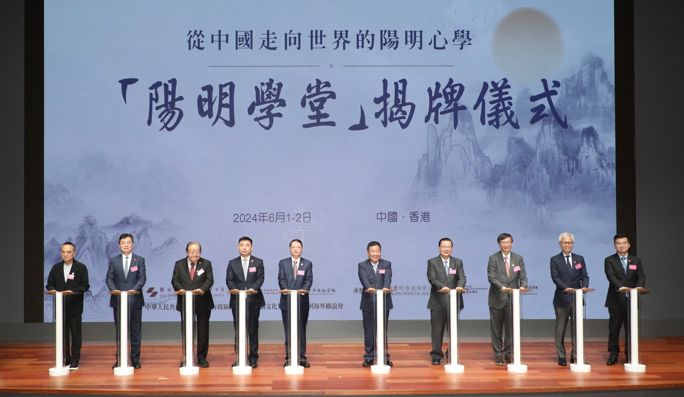 主辦方供圖 香港特別行政區行政長官李家超先生視頻致辭時表示,香港特區政府積極推動弘揚中華文化的工作,於今年四月,正式成立“弘揚中華文化辦公室”,專責策劃推動 中華文化和歷史的活動、交流和合作,增加市民對國家和國民身份的認同。貴州是王陽明參學悟道之地,一直積極推廣陽明文化,加強人民對陽明心學的認知和體悟,傳播中華哲學與文化。是次於香港舉辦首屆陽明心學國際論壇,雲集世界各地知名學者, 成立“陽明學堂”,是香港發揮自身優勢,推動中華文化“走出去”、說好中華文化故事的好例子。他借用王陽明“志不立,天下無可成之事。”與在座嘉賓學者分享, 領略其做人處事情的智慧,最後祝願“陽明學堂”未來工作成果豐碩。 貴州省委常委、省委統戰部部長郭強先生致辭時表示,五百多年前王陽明創立了獨具一格的心學體系,此後陽明心學流傳中國,影響東亞,走向世界。陽明心學心即 理的人生論,致良知的修養論,事上磨的認識論,知行合一的實踐論凝聚着中華優秀傳統文化的精華,必將在大變革的當今迸發出更加光輝的時代價值。他談到王陽明與貴州早有淵源,在貶謫貴州之時,留下多部傳世名篇,陽明文化成為貴州鮮明的標識, 也是公認的陽明心學誕生地。他提出四點倡議:一是以“香港陽明學堂”為平台,匯 聚世界各地專家學者,助力陽明心學的國際傳播;二是以陽明心學國際論壇為載體, 定期組織學術研究及交流;三是以建設中華民族現代文明為使命,充分挖掘陽明心學的價值;四是通過陽明心學促進文明交流互鑒。最後,他借用王陽明“此心光明,亦復何言!”與在座嘉賓學者分享。 紫荊文化集團董事長許正中先生致辭時表示,王陽明心學是中國傳統文化的精華, 源遠流長,影響廣泛。習近平總書記多次提及引用其學說主張,強調誠意正心,知行 合一,自覺做為學為人的表率。香港正在打造“中外文化藝術交流中心”,“陽明學堂”生逢其時,大有可為,立足香港,面向海外,弘揚以陽明心學為主要內容的中華 優秀傳統文化,擴大中華文化影響力。他又分享對“陽明學堂”的三點期盼:一是以學弘道,致力建設開放性國際學術研究平台,二是以文化人,致力打造國際化中華文化傳播交流平台,三是以心明德,致力推動構建人類命運共同體,並祝願“陽明學堂” 篤行致遠。 貴州省委常委、統戰部部長郭強先生,紫荊文化集團董事長許正中先生,中央政府駐港聯絡辦協調部部長朱文先生,全國港澳研究會副會長、香港再出發大聯盟秘書 長譚耀宗先生,香港中文大學原校長金耀基教授,全國政協委員、香港教育大學校長李子建教授,全國政協會員、香港立法會議員、香港嶺南大學協理副校長劉智鵬教授, 香港故宮文化博物館館長吳志華博士,香港文聯副會長、香港美協主席林天行先生, 聯合出版集團董事長傅偉中先生,作為主禮嘉賓共同為“陽明學堂”揭牌。