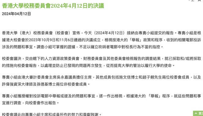 聯署人包括前教育統籌局局長羅范椒芬、前港區全國人大代表蔡素玉等。聯名信指出,對於近日大學校委會在未經與校長協商的情況下,迅速通過委任多位暫任副校長人選,再次激發校內矛盾,影響大學正常運作,深感憂慮,並對校委會主席的管理能力失去信心。因此修書陳情,希望校監採取果斷行動,早日平息風波。 信中提到,我們當中有多位前校委會成員,熟悉校委會的權責和管理層的分工。校委會如同企業的董事會,角色是提供戰略指引,確保風險管理及內部監控系統的成效,並監督管理層依法合規行事,但不會直接參與行政事務。學術機構的文化與商業機構不一樣,要求主席有廣闊的胸襟、見識和領導能力,能夠帶領機構儘快回復正常的運作,維持崇高的聲譽及獲得各界的廣泛支持。回顧歷史,多位前任校委會主席與大學校長都能夠互相尊重,坦誠溝通,合作愉快。他們共同帶領香港大學攀上今天的國際地位,成就來之不易,必須好好珍惜。 “母校近日的風波已被傳媒廣泛報道,並引起國際社會關注。假如政府默認校委會的決定,將造成政府通過委任主席操控大學,架空校長的印象,不利香港高等教育的發展和自由開放的國際形象。”聯名信指出,高等教育是香港的競爭優勢之一,香港大學是香港首屈一指的高等教育機構,希望校監於此艱難時刻,履行法律賦予的職責,挺身而出,為維護香港大學的聲譽,責令校委員會主席盡快與校長協商,提出補救方案供閣下考慮採納執行。 張翔5日在中英文電郵中,承認港大在過去一年,內部紛爭不斷,衝擊大學的運作,難免會影響香港大學未來的聲譽和地位。因惡意匿名投訴引發的調查長達半年,剛剛落幕。他批評校委會5月28日舉行會議,在他和校委會成員事先毫不知情的情況下,有決議被提出,以任命幾位暫任副校長。 張翔稱,《香港大學條例及規程》賦予校長任命暫任高層管理人員的權力,指今次任命暫任副校長的程序違反既定程序,並背離任命高級管理層時需事先進行溝通和討論的良好管治基本原則。“所有暫任副校長的人選建議均非由我提出,事前也沒有諮詢我的意見,大學管理層對此一無所知”。 他批評,“這樣的行為動搖香港大學學術自主的百年基石,不利香港大學和香港的穩定與發展,更談不上吸引全球人才。作為一校之長,我有責任維護大學的百年優良傳統、管理機制和程序,確保大學的正常運作」,又強調「必須尋求解決之道,捍衛大學的尊嚴”。(完) 【編輯:陈卓仪】