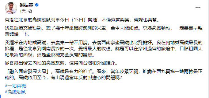 香港新聞網6月17日電 京港、滬港“夕發朝至”高鐵動臥列車15日晚首航,香港前特首梁振英發文感歎,融入國家發展大局,高鐵是有力的推手。看來,當年咬緊牙關,推動在西九實施“一地兩檢”是正確的。他又問,“高鐵啟用至今,有出現過當年反對派擔心的問題嗎?” 北京西、上海與香港紅磡站間開行的普速直通車,提質升級為北京西、上海虹橋與香港西九龍站間的高鐵動臥列車。列車班次在周五至周一開出,北京、上海至香港的時間分別壓縮至12小時34分及11小時14分,並採用“一地兩檢”模式。 京港、滬港“夕發朝至”高鐵動臥列車15日晚首航,當天,梁振英在社交平台臉書寫道,香港往北京的高鐵動臥列車開通,不僅乘客興奮,傳媒也興奮。 他形容自己是軌道交通粉絲,強調京港高鐵動臥,一定要盡早親身體驗一下。