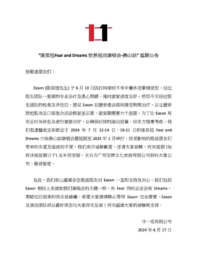 公告截圖 公告指出,經紀公司表示,經過醫生團隊一星期的專業治療及悉心照顧,Eason目前康復進度良好,再過多兩天應可出院回家休養。經過醫生團隊的檢查及評估後,因為骨裂部分需要時間自然癒合,康復期需六星期,醫生建議Eason最好給予身體充足時間休息及進行復康物理治療,以確保日後演出質量不受影響,所以團隊今天遺憾地宣布原定於2024年7月12-14日、19-21日的陳奕迅Fear and Dreams六場佛山站演唱會需延期至2025年1月舉行。 有關延期 (包括詳細延期日子) 及補償安排,主辦方廣州寶輝文化發展有限公司將向大家公布,敬請留意。 (完) 【編輯:陳偉根】