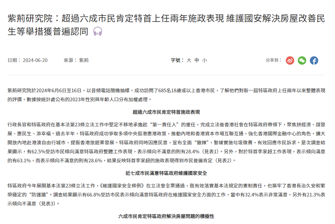 紫荊雜誌截圖 超過六成市民肯定特首施政表現 行政長官和特區政府在基本法第23條立法工作中堅定不移地承擔起“第一責任人”的重任,完成立法後香港社會在特區政府帶領下,聚焦拼經濟、謀發展、惠民生、添幸福。過去半年,特區政府成功爭取多項中央挺港惠港政策,推動內地和香港資本市場互聯互通,強化香港國際金融中心的角色,擴大開放內地赴港澳自由行城市,提振香港旅遊業發展。特區政府同時因應民意,宣布全面“撤辣”,暫緩實施垃圾徵費,有效回應市民訴求。是次調查結果顯示,有62.5%受訪市民傾向滿意特區政府整體工作表現,表示傾向不滿意的則有28.4%。另外,對於特首李家超工作表現,表示傾向滿意的有63.1%,而表示傾向不滿意的則有28.6%,結果反映特首李家超的施政表現得到市民普遍肯定。 近七成市民滿意特區政府維護國家安全 特區政府今年展開基本法第23條立法工作,《維護國家安全條例》在立法會全票通過,既有效落實基本法規定的憲制責任,也築牢了香港長治久安和繁榮穩定的“防護牆”。調查結果顯示有66.8%受訪市民表示傾向滿意特區政府在維護國家安全方面的工作,當中有32.4%表示非常滿意,另外有21.3%表示傾向不滿意。 六成市民肯定特區政府解決房屋問題的積極性 就住受訪市民對特區政府在不同政策範疇表現的取態,調查顯示最多受訪市民認同特區政府的房屋政策。特首李家超上任提出多管齊下解決房屋問題,包括首次提出興建簡約公屋,以填補短期公營房屋供應不足的缺口。近日第一批簡約公屋成功落成並接受申請,反映政策得到有效落實。此外,特區政府同時成立“解決劏房問題”工作組,計劃提交劏房標準建議,以取締不適切居所。圍繞市民對特區政府解決住屋問題的意見,是次調查發現受訪市民對特區處理房屋問題積極性表示肯定,有17.8%受訪市民表示“非常滿意”,另外有42.7%表示“滿意”,整體傾向滿意的比率達60.5%,另外有25.8%受訪市民表示傾向不滿意,調查結果顯示特區政府的房屋政策有助市民更快“上樓”。 保障勞工福利、改善民生、鼓勵生育、發展創科等工作得到過半市民認同 在保障勞工福利方面,行政長官今年會同行政會議接納最低工資一年一檢,有關改革使法定最低工資水平更貼近社會經濟變化,有效保障基層僱員利益。此外,特區政府透過輸入外勞的行業計劃和補充勞工計劃,有效舒緩各行業勞工短缺的問題。針對特區政府在保障勞工福利方面的表現,逾半(52.0%)受訪市民認為“滿意”(16.7%)或“非常滿意”(35.3%),而表示傾向不滿意的則有28.9%。 在關顧民生方面,特區政府持續推出惠及民生的政策,透過完善地區治理體系,成立“地區服務及關愛隊伍(關愛隊)”,在地區層面推展各項關愛活動,貫徹“惠民生、添幸福”的施政理念。另外,在推行影響地區民生方面的政策時,特區政府認真聆聽民意,透過垃圾收費“先行先試”計劃,收集地區上不同持份者的意見和試行的經驗,最終在充分聽取民意的基礎上宣布暫緩垃圾收費。調查結果顯示有54.8%受訪市民認同特區政府在關顧民生方面的工作,表示傾向不滿意的則有28.6%,結果反映較多市民肯定特區政府的民生工作。 施政報告提出締造有利育兒的環境,支援新生家庭以鼓勵生育,包括設立新生嬰兒獎勵金、提高與居所有關的稅項扣除最高限額、資助出售單位和公屋優先安排等措施。針對政府推出的一系列鼓勵生育措施,超過五成(51.5%)受訪市民表示“非常滿意”和“滿意”,另外有35.8%則表示傾向不滿意,反映有關措施獲得市民認同。 新一屆特區政府上任後大力投資創科發展,致力推動香港成為國際創新科技中心,對接國家“十四五”規劃。過去兩年,多家創新科技公司落戶香港,政府大力推動新田科技城發展計劃,更有首名香港載荷專家候選人獲選為國家第四批預備航天員。針對特區政府一系列推動創新科技發展的措施,有53%受訪市民表示傾向滿意,另外則有37.2%表示傾向不滿意,反映市民認同香港發展國際創新科技中心的定位。 同時,是次調查問及受訪市民在“振興經濟發展”、“改善交通運輸”、“培育本地人才”和“推動金融市場發展”等不同政策範疇的取態,調查結果顯示在振興經濟包括落實發展總部經濟和樓市“撤辣”方面的工作和透過推行“三隧分流”和“港車北上”等改善交通運輸措施方面,滿意的比率分別有50.0%和51.1%。有48.9%受訪市民傾向認同特區政府在培育本地人才方面例如成立應用科技大學的工作,另外有45.2%傾向滿意推動金融市場發展例如減股票印花稅。這些結果顯示廣大市民對當前儘快恢復和發展經濟、更好融入粵港澳大灣區、提升香港國際競爭力等方面有更多期待。(完) 【編輯:陳偉根】
