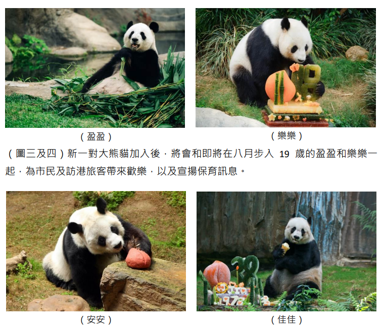 香港新聞網7月1日電 特區政府今日公布,中央政府再度送贈兩隻大熊貓予香港特別行政區,以及牠們將於海洋公園定居,海洋公園對此感到萬分榮幸,並熱切期待與文化體育及旅遊局一起開展相關準備工作,迎接新大熊貓蒞臨此一盛事。 海洋公園公司主席龐建貽表示:“大熊貓佳佳、安安以及盈盈、樂樂分別在1999年及2007年抵港,可說是與香港特區一起成長。中央政府今年再度饋贈大熊貓予香港特區,牠們將聯同盈盈和樂樂,與市民及訪港旅客一起慶祝中華人民共和國成立75周年這個新里程,實在意義非凡。海洋公園衷心感謝中央政府和特區政府的信任,再次將照顧國寶的重任交託予公園團隊。”