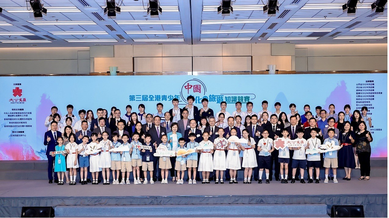 主辦方供圖 全國政協委員、香港大公文匯傳媒集團董事長兼香港文匯報社社長、大公報社社長李大宏,香港特別行政區教育局局長蔡若蓮, 香港特別行政區署理文化體育及旅遊局局長劉震,全國政協常委、中國和平統一促進會香港總會會長姚志勝, 中華人民共和國文化和旅遊部亞洲旅遊交流中心主任張棟, 澳門特別行政區政府旅遊局培訓及質量管理廳廳長梁美彩, 全國人大代表、香港特別行政區立法會議員吳秋北,港區全國人大代表召集人、香港特別行政區立法會議員陳勇, 全國政協委員、銀迅集團董事長莊紫祥等嘉賓主禮,逾兩百位社會知名人士、老師、同學及家長共同見證這一盛事。 該活動由香港大公文匯傳媒集團主辦,亞洲旅遊交流中心聯合主辦,中央政府駐港聯絡辦青年工作部、香港特區政府文化體育及旅遊局、香港特區政府教育局、香港特區政府民政及青年事務局作為特別支持機構。活動以習近平新時代中國特色社會主義思想為指導,深入貫徹黨的二十大精神,堅持以文塑旅、以旅彰文的原則,推進文化和旅遊深度融合發展。旨在讓參賽學生在備賽與競賽的過程中學習和瞭解中國文化和旅遊知識,從而加強對香港青少年的愛國主義教育,提升他們對中國文化的認同感及民族自豪感。賽後還將舉辦“山河韻·中華行——跟著大文看祖國”活動,帶領獲獎的同學們前往擁有悠久歷史和燦爛文化的山西,讓同學在探訪名勝古跡的同時,可以親身瞭解國家的歷史文化、國情和發展現況,增加文化認同感。 李大宏致辭時表示,作為香港經濟的支柱產業之一,文旅業具有“一業興,百業旺”的乘數效應,在拉動消費、促進就業、活躍市場、提振信心等方面可以發揮重要作用。他希望同學們將“讀萬卷書”的感悟、“行萬裡路”的體驗,轉化成為香港振興旅遊業建言獻策的主動性和積極性,帶動社會各方力量共同參與,樹立“無處不旅遊”的理念,充分發掘豐富的旅遊資源,積極借鑒各地成功經驗,創新思路、優化政策,推動大力開發旅遊新路線新產品,弘揚熱情好客之道,不斷提升服務品質,把香港“最佳旅遊目的地”的金字招牌擦得更亮。這也是大文集團組織文旅知識競賽及“跟著大文看祖國”活動的更深層次目的。他期待香港青年一代,厚植家國情懷,涵養進取精神,深刻領悟歷史趨勢,牢牢把握時代脈搏,踔厲奮發,勇毅前行,在推動“一國兩制”事業行穩致遠、投身強國建設、民族復興的偉大進程中,放飛青春之夢想,書寫無悔之人生。