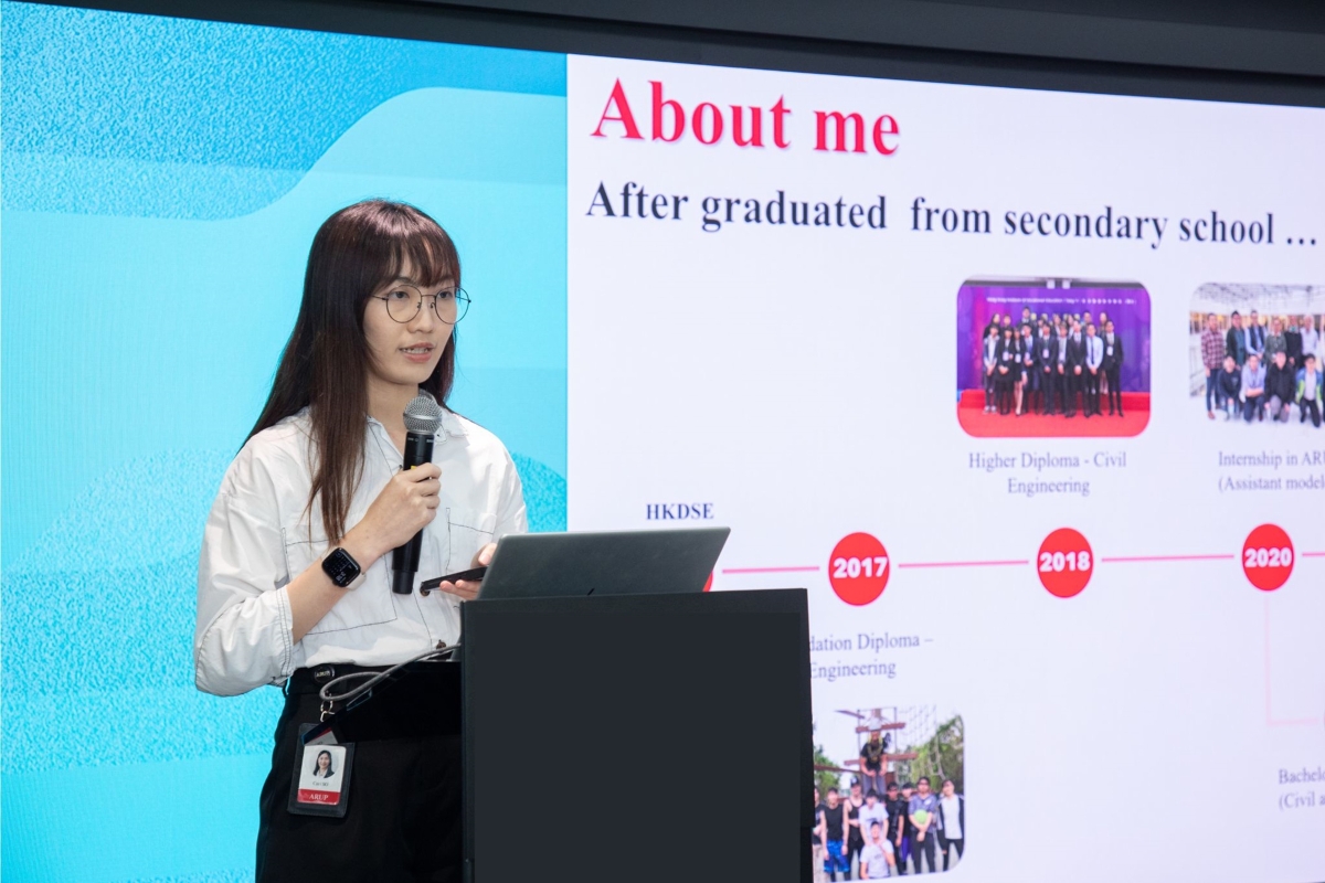 劉學禮。職業訓練局供圖 在學期間,Peter已成功考取14張行內具國際認受性的專業認證,包括AWS及Microsoft Azure等,畢業後他隨即獲IT顧問公司聘請,可見其“搶手”程度,入職薪酬更達港幣2萬多,足以媲美大學畢業生。他其後投身本地大型銀行,擔任雲端工程師,專責處理公司應用程式的雲端管理系統及網絡安全,協助保障銀行及客戶的私隱。 香港專業教育學院(IVE)土木工程高級文憑畢業生蘇詩韻(Ceci)在從事裝修工程的家人薰陶下,自小對工程行業充滿熱誠。Ceci在DSE英文科失手後,決定忠於興趣,報讀IVE基礎課程文憑-工程,其後升讀IVE土木工程高級文憑,一步一步向工程師的目標邁進。