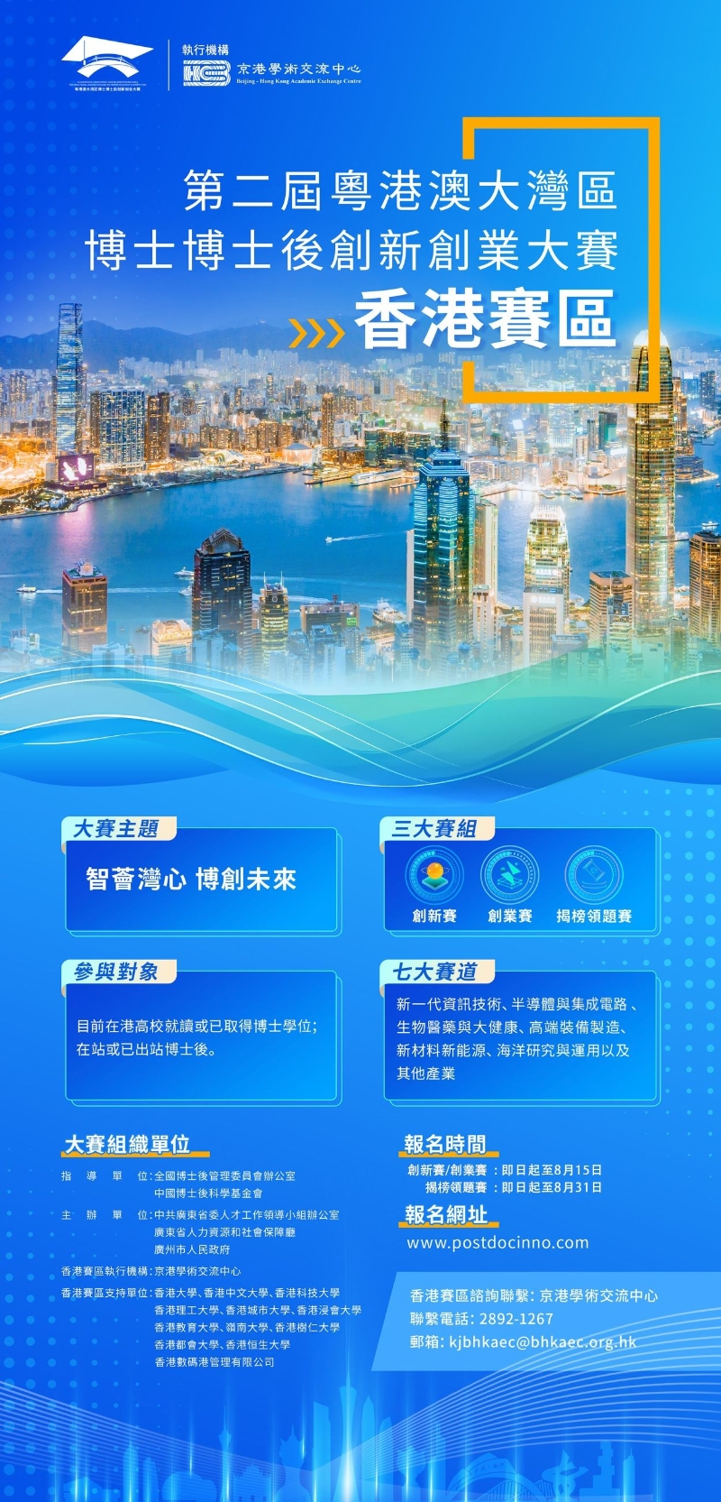 香港新聞網7月24日電 第二屆粵港澳大灣區博士博士後創新創業大賽現正接受報名。本屆大賽以“智薈灣心 博創未來”為主題,由中共廣東省委人才工作領導小組辦公室、廣東省人力資源和社會保障廳、廣州市人民政府聯合主辦,中共廣州市委人才工作領導小組辦公室、廣州市人力資源和社會保障局、廣州市南沙區人民政府聯合承辦。 大賽設創新賽、創業賽、揭榜領題賽三個組別,香港地區可參與創新賽及揭榜領題賽,創新賽香港賽區初賽由京港學術交流中心承辦。 創新賽獲奬項目一年內於南沙創業 可獲最高 300 萬奬勵 創新賽設按照相關專業領域各設立 7 個賽道:新一代資訊技術、半導體與集成電路、生物 醫藥與大健康、高端裝備製造、新材料新能源、海洋研究與運用、其他產業領域,各個賽道設初賽、複賽和決賽三個階段。初賽晉級隊伍將與其他賽區(即廣東賽區、澳門賽區、海外賽區) 相同賽道的隊伍競爭決賽名額,決賽則不分賽區或賽道。