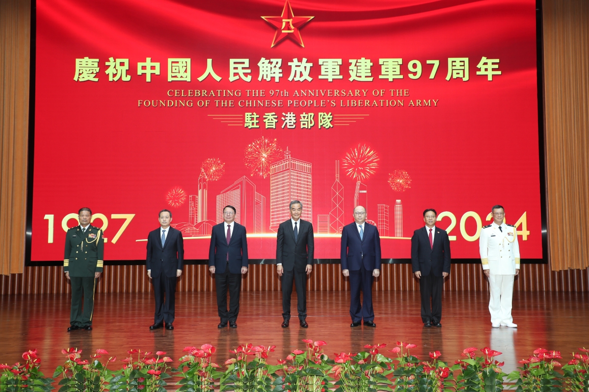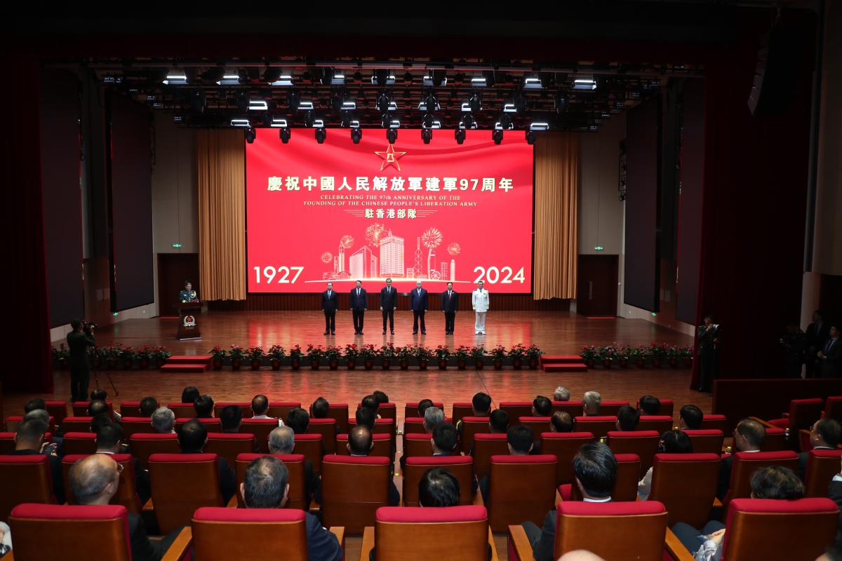 政府新聞處圖片 全國政協副主席梁振英,香港特別行政區署理行政長官陳國基,中央政府駐港聯絡辦主任鄭雁雄,中央駐港國安公署署長董經緯,外交部駐港公署特派員崔建春,駐香港部隊司令彭京堂及政治委員賴如鑫擔任主禮嘉賓。 18時30分許,招待會在威武雄壯的中國人民解放軍軍歌聲中開始,現場播放了反映駐香港部隊建設發展成就的主題短片《向祖國報告》。駐軍彭京堂司令員在致詞中回顧了97年來人民軍隊在中國共產黨的絕對領導下,為民族獨立、國家富強、人民幸福建立的不朽功勳,回顧了駐軍進駐香港27年來堅決聽黨指揮、忠實履行國防職責的生動實踐,表達了對香港特別行政區政府和社會各界長期以來對駐軍關心支持的衷心感謝。