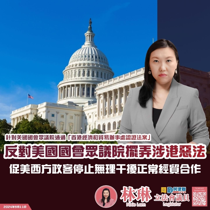 香港新聞網9月11日電 針對美國國會眾議院通過的所謂“香港經濟和貿易辦事處認證法案”,鼓動取消香港特區駐美經貿辦事處的特權豁免待遇甚至關閉辦事處,以其一貫的迷執和偏見合力詆譭本港的國際聲譽,打壓特區對外經貿合作的正常空間,香港民建聯立法會議員林琳11日對此表示堅決反對和憤怒,認為有關惡法對香港長期行之有效的經貿合作及安排肆意抹黑,妄圖破壞特區繁榮穩定的基礎,促請有關府院臨崖勒馬,停止干涉中國內政及香港事務。