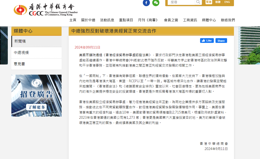 香港工商界強烈反對破壞港美經貿正常交流合作香港新聞網9月11日電 美國眾議院通過《香港經濟貿易辦事處認證法案》,要求行政部門決定香港駐美國三個經濟貿易辦事處能否繼續運作。香港工商界11日對此表示強烈反對。 香港中華總商會呼籲美方停止對香港特區的政治抹黑攻擊和干涉香港事務,並阻礙有利推動港美之間互惠互利經貿交流發展的相關工作。 香港中華總商會指,在“一國兩制”下,香港擁有背靠祖國、聯通世界的獨特優勢。在國家大力支持下,香港積極加強與內地特別是粵港澳大灣區、東盟、RCEP以至“一帶一路”等區域市場深化合作,讓香港的發展空間越來越廣闊。《香港國安法》和《維護國家安全條例》實施以來,社會回復穩定,更為包括美國商界在內的海外企業提供穩定安全的投資環境,香港更是外商拓展粵港澳大灣區市場的重要切入點。 香港在美國設立經濟貿易辦事處,著力促進港美經貿往來互動,為兩地企業提供多方面諮詢及支援服務,推動彼此在不同商貿範疇務實合作,對促進港美經貿關係發展發揮積極作用。事實上,美國在香港享有重大的經濟利益。過去10年,美國對香港的貿易順差達到2715億美元。根據政府統計處資料,2023年在香港營運的美國公司有1273 家;香港更是美國第六大直接投資目的地。