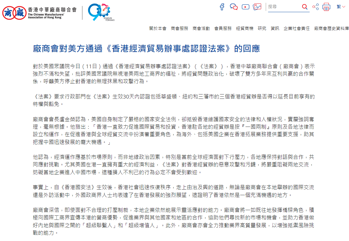 香港中華總商會表示,美方的舉措只會破壞港美互惠互利的關係,最終損害美國及其企業的利益。 香港中華廠商聯合會表示強烈不滿和失望,批評美國眾議院無視港美兩地工商界的福祉,將經貿問題政治化,破壞了雙方多年來互利共贏的合作關係,呼籲美方停止對香港的無理抹黑和攻擊行為。 法案要求行政部門在法案生效30天內認證包括華盛頓、紐約和舊金山市的3個香港經貿辦是否得以延長目前享有的特權與豁免。 廠商會會長盧金榮認為,美國自身制定了嚴格的國家安全法例,卻抵毁香港維護國家安全的法律和人權狀況,實屬強詞奪理,毫無根據。他指出:“香港一直致力促進國際貿易和投資,香港駐各地的經貿辦是按‘一國兩制’原則及各地法律而設立和運作,在促進香港與全球經貿交流中扮演着重要角色,為海外、包括美國企業在香港拓展業務提供重要支援,助其把握中國迅速發展的龐大機遇。”