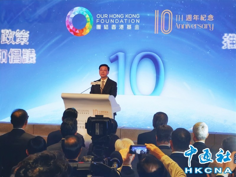 團結香港基金慶祝酒會現場。香港中通社圖片 基金會主席陳智思出席並宣讀中央港澳工作辦公室主任、國務院港澳事務辦公室主任夏寶龍發出的祝賀信。陳智思引述夏寶龍主任賀信內容指,團結香港基金成立十年來,堅定擁護“一國兩制”方針,團結社會各界開展政策研究、弘揚中華文化、編纂香港地方志等工作,形成了一大批研究成果,為保持香港繁榮穩定、提升香港競爭力作出了積極貢獻。 陳智思表示,團結香港基金已經成為全球頂尖1%的智庫。未來,團結香港基金會更好地利用香港獨特的“一國兩制”優勢和作為國際城市的地位,加強與國際社會的聯繫,擴大對國家及香港的敘述,並推動科學、技術與創新的議程,團結社會,爭取更廣泛的支持。 香港特區行政長官李家超、中央政府駐港聯絡辦主任鄭雁雄亦出席並致辭。鄭雁雄指,期待團結香港基金乘改革東風、抓時代機遇、繪發展新篇,在服務國家、建設香港上展現新擔當新作為。 鄭雁雄表示,團結香港基金在優質建言咨政上展現新擔當新作為,有力支持行政長官和特區政府依法施政;在促進文化交流上展現新擔當新作為,匯聚各方力量編好《香港志》,發揮好“存史、資政、育人”功能;在培養咨政人才上展現新擔當新作為,全面建設國際頂尖智庫。 他強調,駐港聯絡辦將全力支持香港智庫堅守正確方向,與時俱進發揮積極作用、不斷發展壯大。(完) 【編輯:淩玉輝】