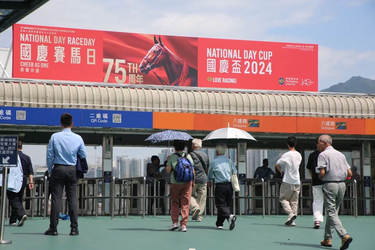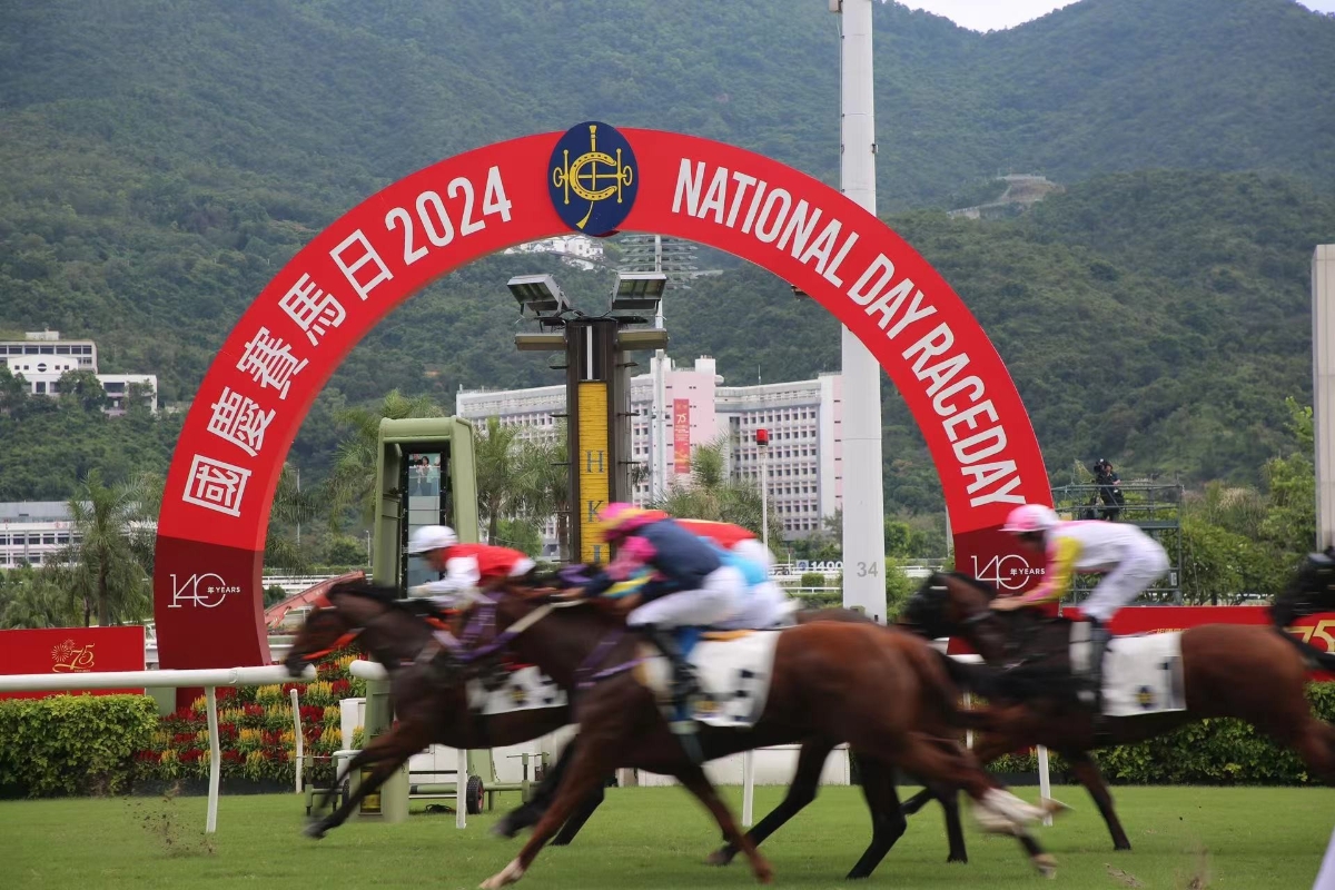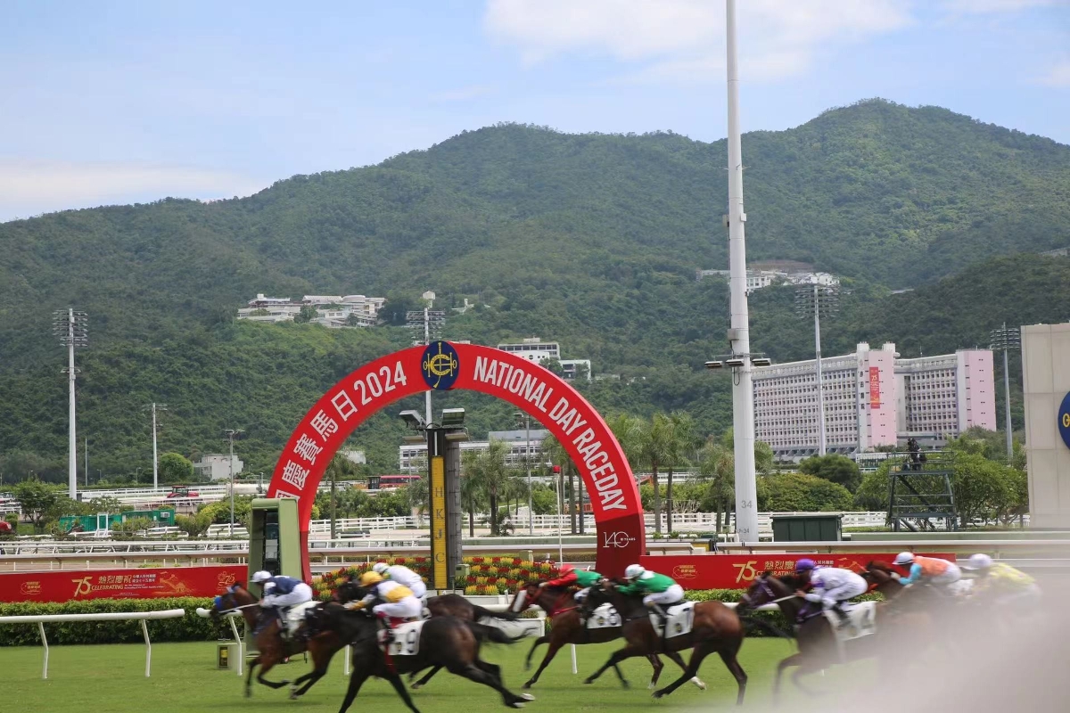 香港賽馬會圖片 當天中午十二點,豔陽高照,天朗氣清。沙田馬場一片紅色主題裝飾,處處可見寫有“75”字樣的標誌。 外交部駐香港特別行政區特派員公署特派員崔建春為開幕儀式主禮。現場擠滿公眾,鼓樂武術表演和男高音歌唱家張英席帶來的演出,熱了場子。隨後全場起立齊聲高唱國歌,不少市民遊客舉起相機,與場內的國旗區旗合影。 香港賽馬會每逢重大節慶日舉辦主題賽馬日,成為很多訪港遊客的打卡項目。中通社記者看到現場有不少年輕背包客,選擇在黃金周來香港旅遊。 廣州的黃小姐與三位閨蜜興奮與馬匹合影。她對記者表示,來香港旅遊輕巧方便,在網上還看到不少精彩活動介紹,第一站就選擇到馬場來,趕上了開幕儀式唱國歌的環節;“今天是祖國生日,我在香港聽到了國歌,很特別的體驗,現場很熱鬧,儀式感拉滿,香港太有國慶氛圍了!” 國慶日也是香港的公眾假期,沙田街坊喝完早茶,結伴看賽馬;也有外籍居港人士特地前來感受歡慶氛圍。 從事運輸行業的梁先生今年73歲,他點讚香港慶祝國慶的氛圍越來越熱鬧,聽著國歌響起,更能感受到祖國75年來日新月異的發展,感到非常自豪。他笑說,國運亨通,希望國慶日在馬場也能有好運連連。 國慶賽馬日,香港氣溫高達32攝氏度,公眾熱情未減,在草場旁一邊鼓掌一邊大喊“衝!”,熱鬧場面成為遊客最愛的視頻素材。 當天沙田馬場舉辦10場賽事,焦點賽事為第7場總獎金達420萬港元的“國慶盃”,最終由華人練馬師伍鵬志訓練、巴度策騎的“美麗第一”勝出。賽後,香港中聯辦秘書長王松苗頒獎予勝出馬主和練馬師。“國慶盃”於1999年設立,從2016/2017年度賽馬季起,獲升格為國際三級賽。賽事獎杯是一座手工制作的中國銀碗。