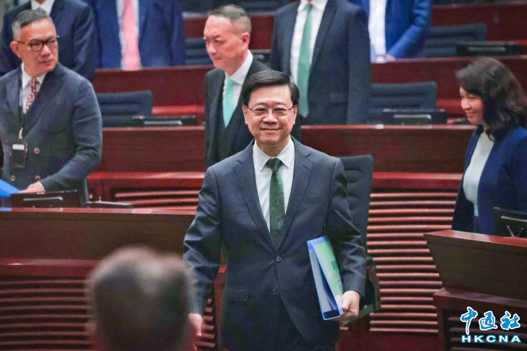 李家超在立法會發表其任內第三份施政報告 (謝光磊 攝) 李家超表示,二十屆三中全會審議通過《中共中央關於進一步全面深化改革、推進中國式現代化的決定》,指出要充分發揮“一國兩制”制度優勢,鞏固提升香港國際金融、航運、貿易中心地位,支持香港打造國際高端人才集聚高地,健全香港在國家對外開放中更好發揮作用的機制;深化粵港澳大灣區合作,強化規則銜接、機制對接。