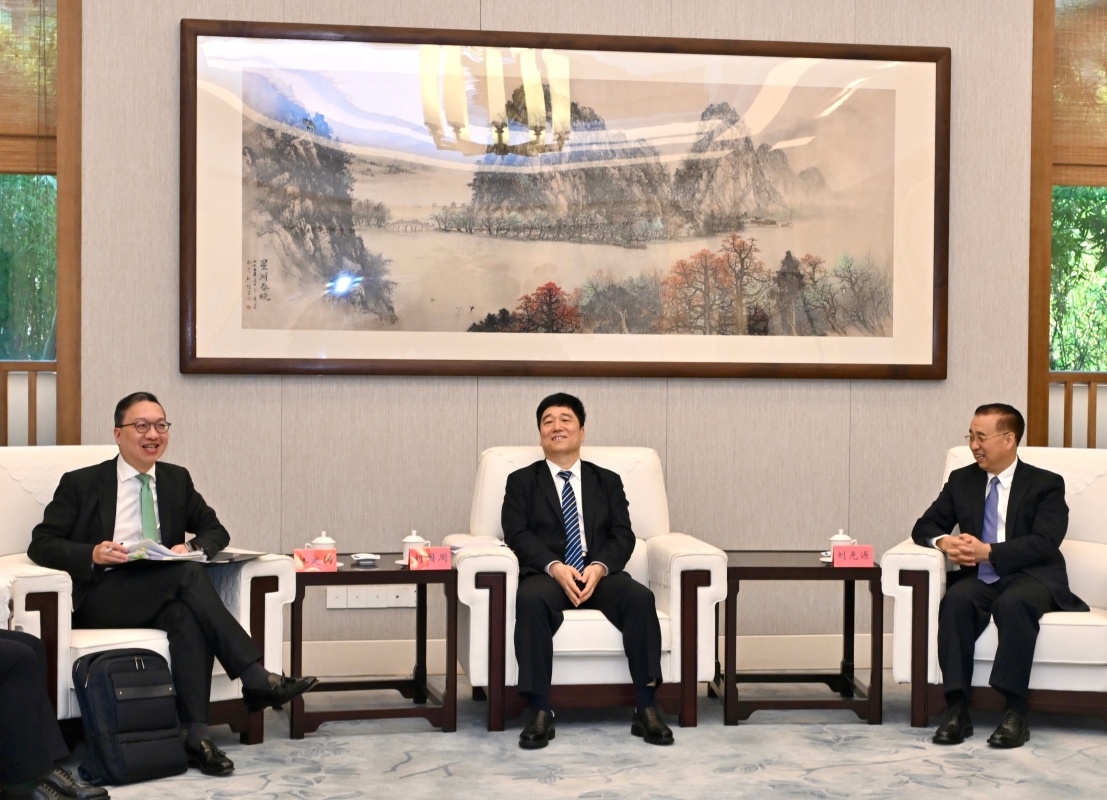 圖源:政府新聞處 林定國上午拜訪廣東省人民政府,與廣東省副省長劉國周會面,並連同廣東省司法廳、廣東省發展和改革委員會、廣東省人民政府國有資產監督管理委員會、廣東省商務廳,以及國務院港澳事務辦公室、中央人民政府駐香港特別行政區聯絡辦公室和廣東省港澳事務辦公室的代表舉行會議,了解廣東省及粵港澳大灣區的最新發展,並就進一步加強香港法律界與內地部委、法律界和企業的合作機遇交換意見。
