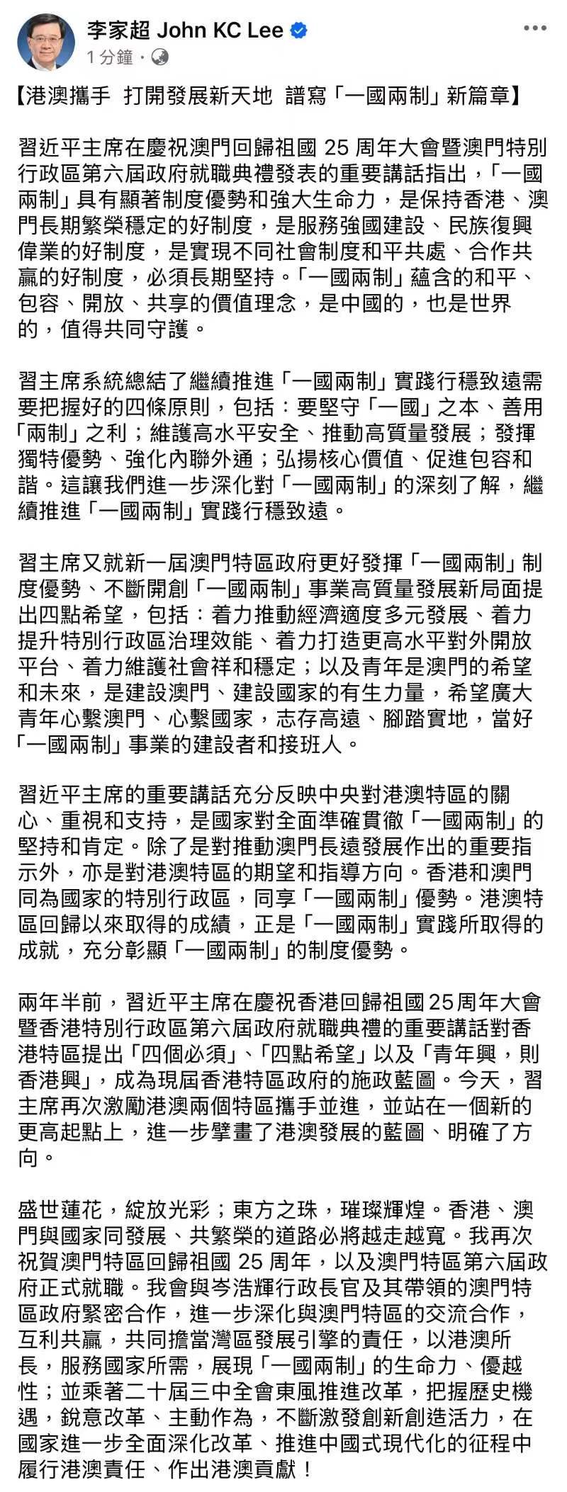 (澳門回歸25周年)李家超:港澳攜手打開發展新天地 譜寫“一國兩制”新篇章香港新聞網12月20日電 慶祝澳門回歸祖國25周年大會暨澳門特別行政區第六屆政府就職典禮20日在澳門舉行。中共中央總書記、國家主席、中央軍委主席習近平出席。在習主席監誓下,岑浩輝宣誓就任澳門特區行政長官。出席活動的香港特別行政區行政長官李家超在社交平台以“港澳攜手 打開發展新天地 譜寫‘一國兩制’新篇章”為題發文,以下為全文: 習近平主席在慶祝澳門回歸祖國 25 周年大會暨澳門特別行政區第六屆政府就職典禮發表的重要講話指出,“一國兩制”具有顯著制度優勢和強大生命力,是保持香港、澳門長期繁榮穩定的好制度,是服務強國建設、民族復興偉業的好制度,是實現不同社會制度和平共處、合作共贏的好制度,必須長期堅持。“一國兩制”蘊含的和平、包容、開放、共享的價值理念,是中國的,也是世界的,值得共同守護。 習主席系統總結了繼續推進“一國兩制”實踐行穩致遠需要把握好的四條原則,包括:要堅守“一國”之本、善用“兩制”之利;維護高水平安全、推動高質量發展;發揮獨特優勢、強化內聯外通;弘揚核心價值、促進包容和諧。這讓我們進一步深化對“一國兩制”的深刻了解,繼續推進“一國兩制”實踐行穩致遠。 習主席又就新一屆澳門特區政府更好發揮“一國兩制”制度優勢、不斷開創“一國兩制”事業高質量發展新局面提出四點希望,包括:着力推動經濟適度多元發展、着力提升特別行政區治理效能、着力打造更高水平對外開放平台、着力維護社會祥和穩定;以及青年是澳門的希望和未來,是建設澳門、建設國家的有生力量,希望廣大青年心繫澳門、心繫國家,志存高遠、腳踏實地,當好“一國兩制”事業的建設者和接班人。 習近平主席的重要講話充分反映中央對港澳特區的關心、重視和支持,是國家對全面準確貫徹“一國兩制”的堅持和肯定。除了是對推動澳門長遠發展作出的重要指示外,亦是對港澳特區的期望和指導方向。香港和澳門同為國家的特別行政區,同享“一國兩制”優勢。港澳特區回歸以來取得的成績,正是 “一國兩制”實踐所取得的成就,充分彰顯“一國兩制”的制度優勢。 兩年半前,習近平主席在慶祝香港回歸祖國25周年大會暨香港特別行政區第六屆政府就職典禮的重要講話對香港特區提出“四個必須”、“四點希望” 以及“青年興,則香港興”,成為現屆香港特區政府的施政藍圖。今天,習主席再次激勵港澳兩個特區攜手並進,並站在一個新的更高起點上,進一步擘畫了港澳發展的藍圖、明確了方向。 盛世蓮花,綻放光彩;東方之珠,璀璨輝煌。香港、澳門與國家同發展、共繁榮的道路必將越走越寬。我再次祝賀澳門特區回歸祖國 25 周年,以及澳門特區第六屆政府正式就職。我會與岑浩輝行政長官及其帶領的澳門特區政府緊密合作,進一步深化與澳門特區的交流合作,互利共贏,共同擔當灣區發展引擎的責任 ,以港澳所長,服務國家所需,展現“一國兩制”的生命力、優越性;並乘著二十屆三中全會東風推進改革,把握歷史機遇,銳意改革、主動作為,不斷激發創新創造活力,在國家進一步全面深化改革、推進中國式現代化的征程中履行港澳責任、作出港澳貢獻!