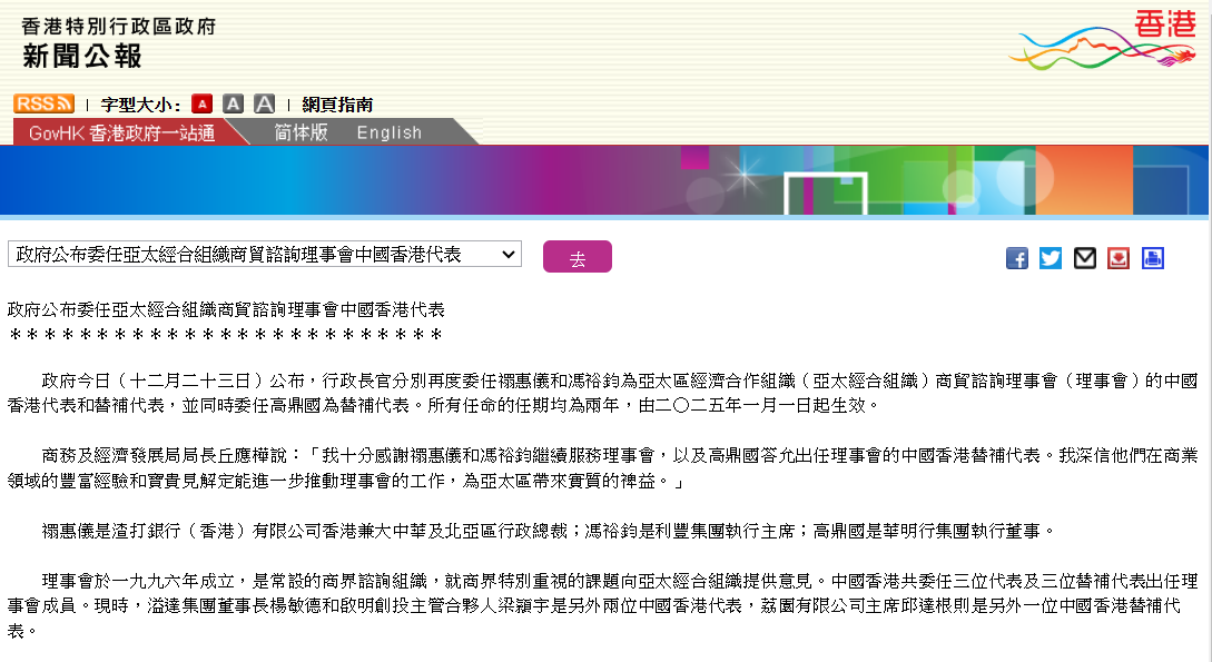 香港新聞網12月23日電 香港特區政23日公布,行政長官分別再度委任禤惠儀和馮裕鈞為亞太區經濟合作組織(亞太經合組織)商貿諮詢理事會(理事會)的中國香港代表和替補代表,並同時委任高鼎國為替補代表。所有任命的任期均為兩年,由2025年1月1日起生效。