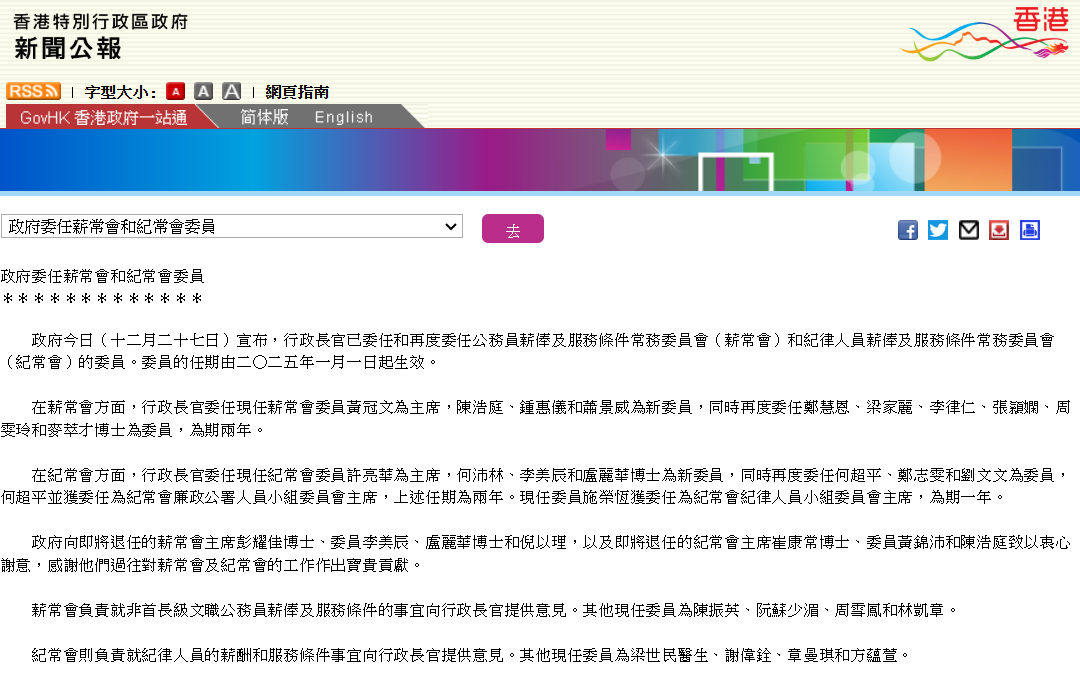 香港新聞網12月27日電 香港特區政府27日宣布,行政長官已委任和再度委任公務員薪俸及服務條件常務委員會(薪常會)和紀律人員薪俸及服務條件常務委員會(紀常會)的委員。委員的任期由明年1月1日起生效。 在薪常會方面,行政長官委任現任薪常會委員黃冠文為主席,陳浩庭、鍾惠儀和蕭景威為新委員,同時再度委任鄭慧恩、梁家麗、李律仁、張頴嫻、周雯玲和麥萃才博士為委員,為期兩年。