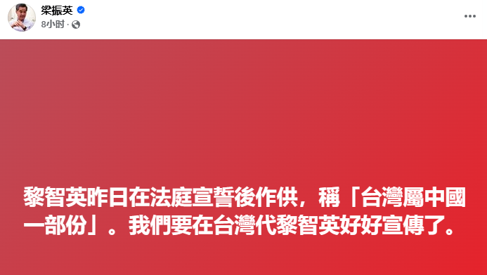 香港新聞網1月7日電 新年後首次出庭,香港壹傳媒創辦人黎智英自辯時表示,台灣屬中國一部分。对此,香港前特首梁振英表示,“我們要在台灣代黎智英好好宣傳了。” 黎智英被控違反香港國安法案今日(7日)踏入第115日審訊,黎智英第23日出庭自辯。辯方在庭上播放2020年10月22日黎智英訪談節目的片段,當中他提到希望特朗普可以連任美國總統,更每天禱告特朗普獲得的票能多於拜登。 黎智英作供時解釋,特朗普曾承諾會嚴肅處理香港議題,所以希望他連任。 在昨日第114日的審訊中,辯方就2020年10月1日訪談節目的內容向黎智英提問,黎智英在2020年10月《Live Chat with Jimmy Lai》節目中提到美國應保護台灣的芯片技術,又認為台灣“會成為非常獨特的國家”。在辯方提問下,黎智英在庭上稱台灣屬中國一部分,否認提倡“台獨”,同意可以其他字眼取代“國家”。法官質疑黎智英同時在節目上稱“台灣正透過與美國的關係創建一個國家,塑造其未來”,黎智英則重申台灣並非主權國。 對此,梁振英在社交平台發文表示,黎智英6日在法庭宣誓後作供,稱“台灣屬中國一部分”。“我們要在台灣代黎智英好好宣傳了。”