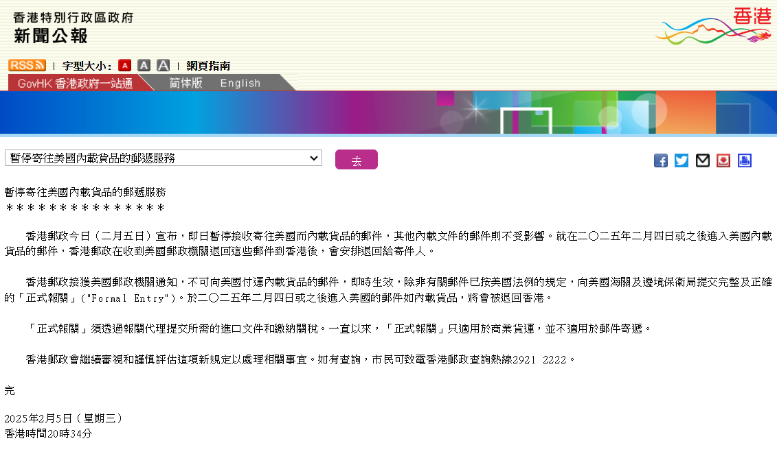 香港郵政接獲美國郵政機關通知,不可向美國付運內載貨品的郵件,即時生效,除非有關郵件已按美國法例的規定,向美國海關及邊境保衛局提交完整及正確的“正式報關”("Formal Entry")。於2025年2月4日或之後進入美國的郵件如內載貨品,將會被退回香港。 “正式報關”須透過報關代理提交所需的進口文件和繳納關稅。一直以來,“正式報關”只適用於商業貨運,並不適用於郵件寄遞。 香港郵政會繼續審視和謹慎評估這項新規定以處理相關事宜。如有查詢,市民可致電香港郵政查詢熱線2921 2222。 (完) 【編輯:譚暢】