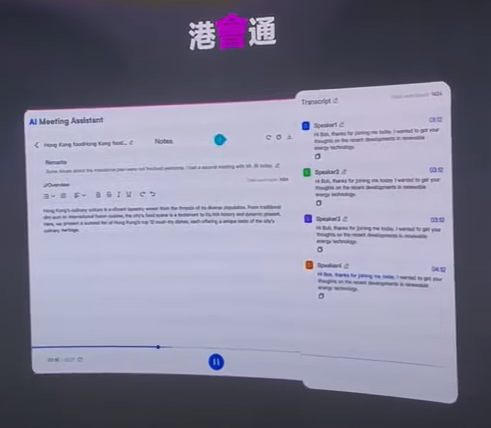 圖為“港會通”平台畫面(香港中通社視頻截圖) 會議展覽業的蓬勃一直是香港文化商貿的國際名片之一,《財政預算案》指出為配合北部都會區的商業及創科發展,特區政府將會在區內物色合適地方,供興建設施以切合不同類型的會議和展覽需求。“港會通”作為會議專用AI平台,可以通過會議錄音,記錄發言人的觀點,並分析整理成會議概要及會議記錄。香港國際金融貿易中心,有來自五洲四海的企業落戶,因此能適配多語言的“港會通”平台更可降低香港企業中來自不同文化背景的員工之溝通成本。