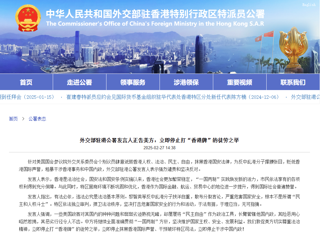 圖片來源:外交部駐港公署官網截圖 發言人表示,香港是法治社會,國安法和國安條例實施以來,香港社會更加繁榮穩定,“一國兩制”實踐煥發新的活力,市民依法享有的各項權利得到充分保障。與此同時,特區營商環境不斷鞏固和優化,香港作為國際金融、航運、貿易中心的地位進一步提升,得到國際社會普遍贊譽。 發言人指出,有法必依,違法必究是法治基本原則。黎智英等反中亂港分子挾洋自重,散佈分裂言論,嚴重危害國家安全,根本不是所謂“民主和人權鬥士”。特區依法獨立審判,捍衛法治秩序,堅決打擊危害國家安全的行為和活動,於法有據,於理應當,無可指摘。 發言人強調,一些美國政客對其國內的種種問題和斑斑劣跡熟視無睹,卻屢屢將“民主自由”作為政治工具,長臂管轄他國內政,其險惡用心昭然若揭,其惡劣行徑令人不齒。中方將繼續全面準確貫徹“一國兩制”方針,堅決維護國家主權、安全、發展利益。我們敦促美方切實尊重法治精神,立即停止打“香港牌”的徒勞之舉,立即停止抹黑香港國際聲譽、干預破壞特區司法,立即停止干涉中國內政!(完) 【編輯:林曉惠】