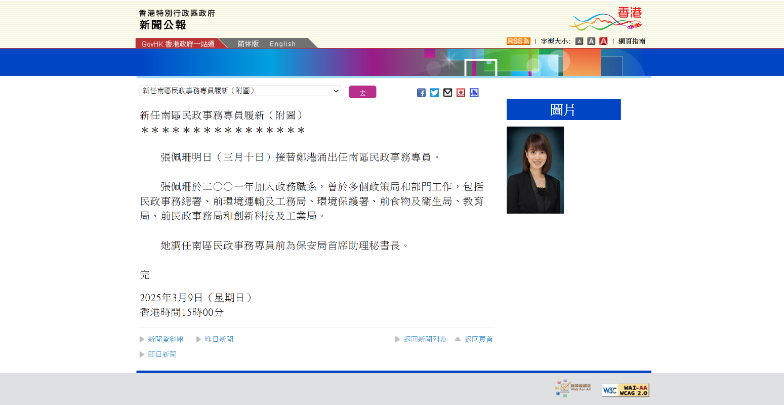 她調任南區民政事務專員前為保安局首席助理秘書長。  (完)