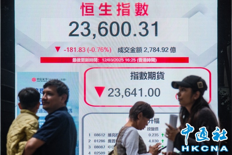 香港中通社3月12日電(記者 張明臻)美股連跌兩日,市場擔心美國衰退風險。恆指12日收報23600點,微跌181點或0.8%;大市全日成交2784億港元。