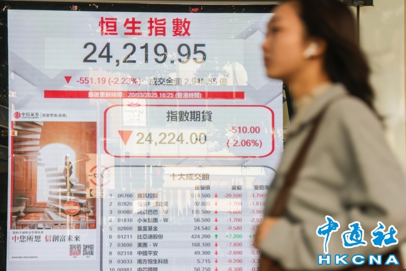 香港中通社3月20日電(記者 徐嘉儀)美國聯儲局議息後維持預計今年將減息兩次合共半厘,帶動美股造好,不過反映中概股表現的金龍指數滑落,港股20日回吐逾500點。恆生指數收市報24219點,跌551點。大市成交額為2948億港元。