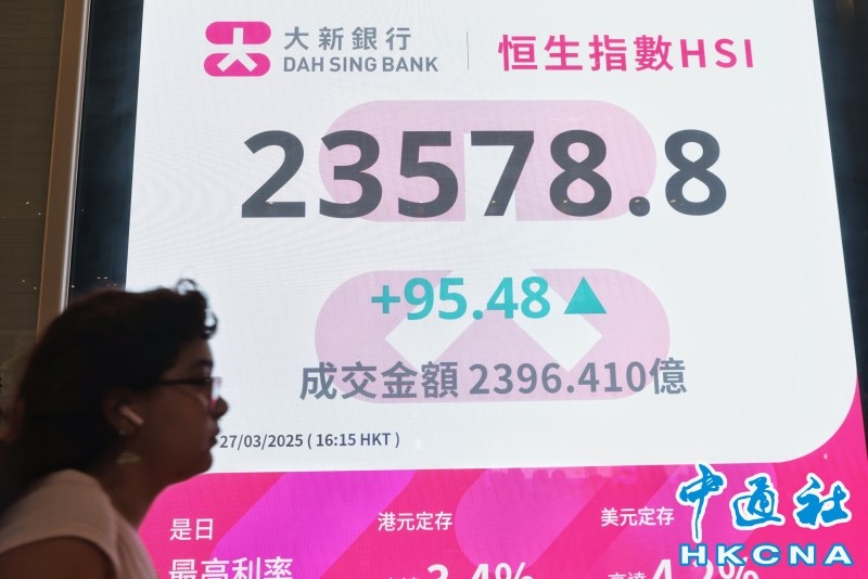 香港中通社3月27日電(記者 譚暢)美國26日宣佈對所有“非美國製造”汽車徵收25%關稅,將於4月2日起生效,隔晚美股受壓,但人民幣27日回升,大行看好中國市場,港股27日收市升95點或0.4%,報23578點。大市全日成交約2396億港元。