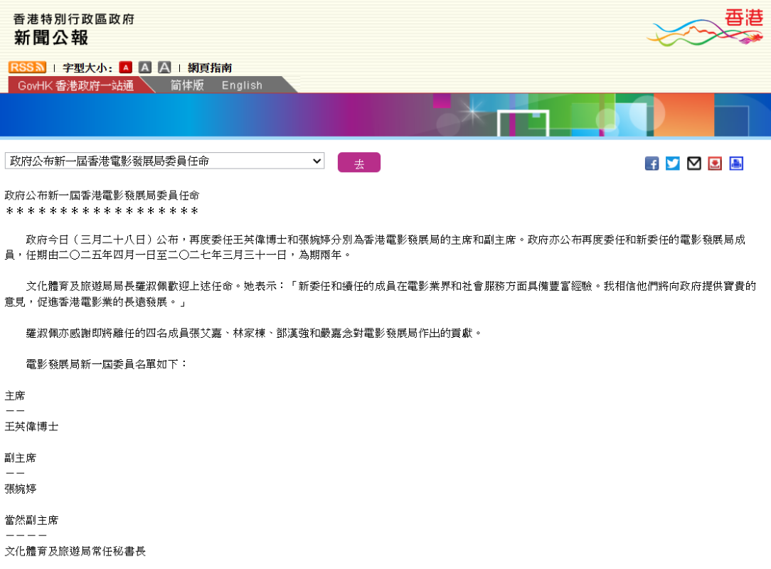 香港新聞網3月28日電 香港特區政府28日公布,再度委任王英偉和張婉婷分別為香港電影發展局的主席和副主席。政府亦公布再度委任和新委任的電影發展局成員,任期由2025年4月1日至2027年3月31日,為期兩年。
