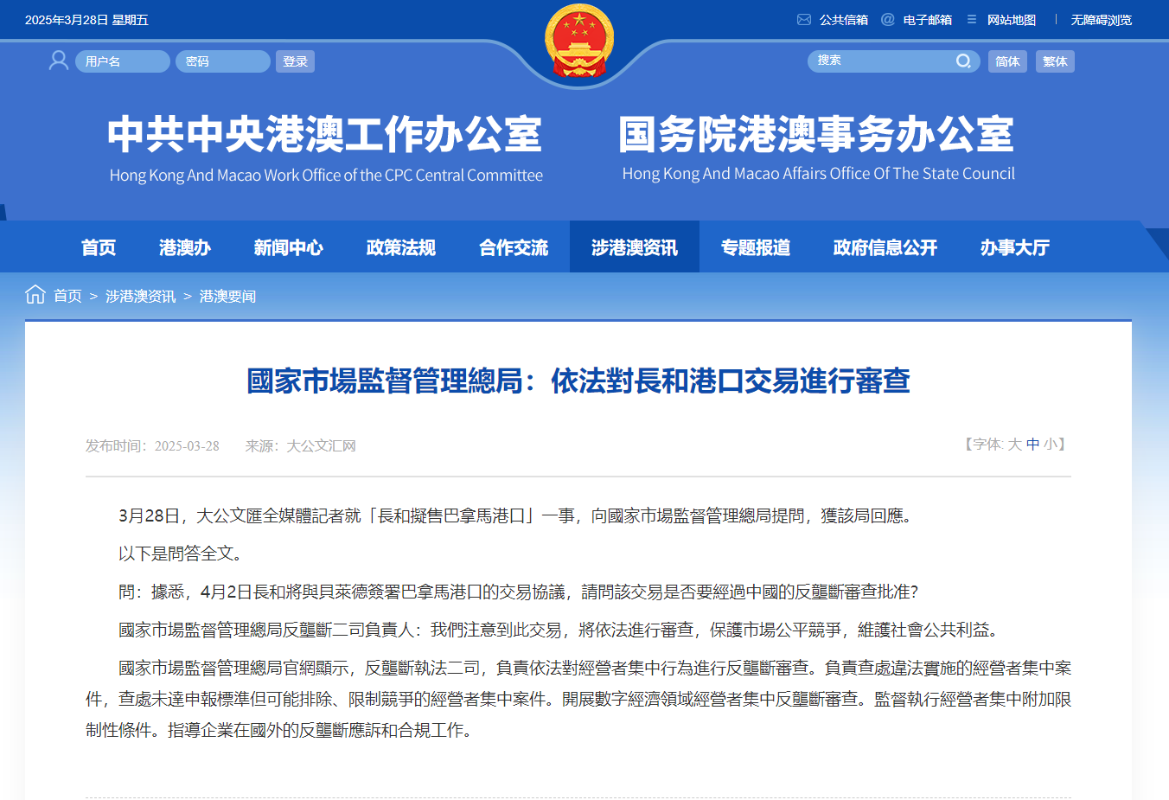香港新聞網3月28日電 3月28日,大公文匯全媒體記者就“長和擬售巴拿馬港口”一事,向國家市場監督管理總局提問,獲該局回應。