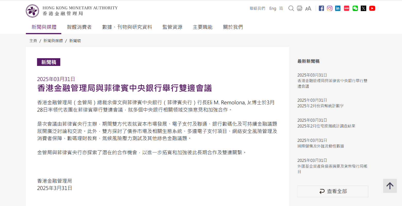 香港金管局官網截圖 是次會議由菲律賓央行主辦,期間雙方代表就資本市場發展、電子支付及聯通、銀行數碼化及可持續金融議題展開廣泛討論和交流。此外,雙方探討了債券市場及相關生態系統、多邊電子支付項目、網絡安全風險管理及消費者保障、數碼理財教育、氣候風險壓力測試及其他綠色金融議題。 金管局與菲律賓央行亦探索了潛在的合作機會,以進一步拓寬和加強彼此長期合作及雙邊關繫。 (完) 【編輯:梁嘉軒】