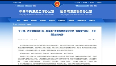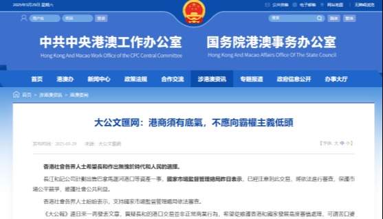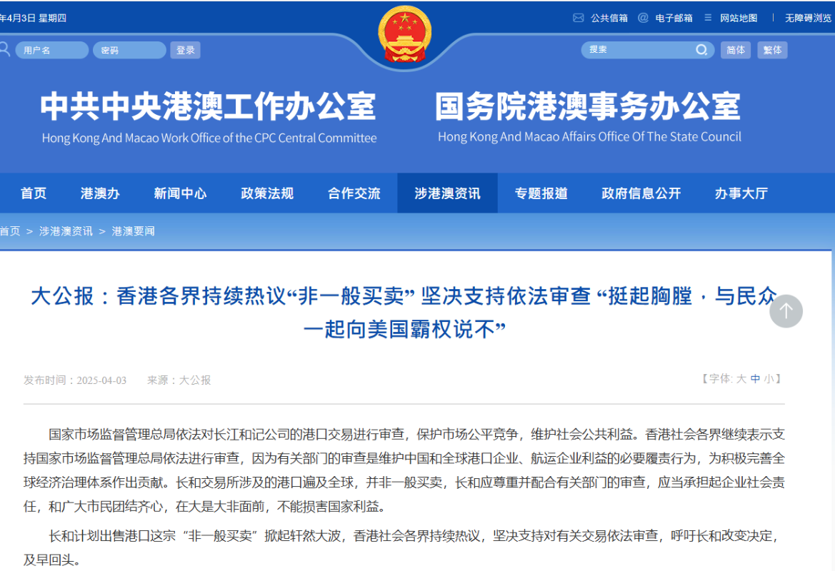 港澳辦轉大公報文章:美國所謂“制裁”是徹頭徹尾霸權行徑香港新聞網4月3日電 國務院港澳辦官網連日來轉載香港大公報文章,3日轉載該報引述香港各界持續熱議國家市場監督管理總局依法對長江和記公司的港口交易進行審查。以下為原文: