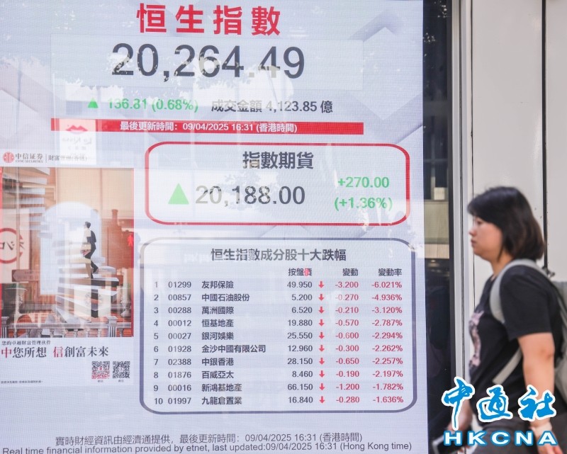 香港中通社4月9日電(記者 徐嘉儀)美國向所有中國商品徵收104%關稅,美股急升後倒跌,惟市場憧憬內地政策,在A股拉升帶動下,恆生指數收市報20264點,升136點。大市成交額為4123億港元。