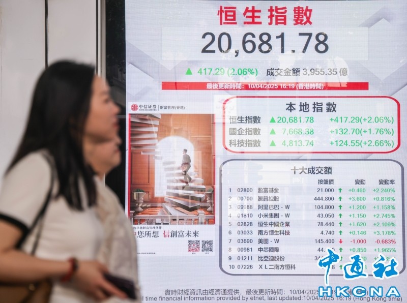 香港中通社4月10日電(記者 張明臻)美國宣佈對部分國家暫停實施新關稅,為期90天,美股隔晚大幅反彈,港股亦連升三個交易日。恆指10日收報20681點,升417點或2.1%;大市全日成交3955億港元。