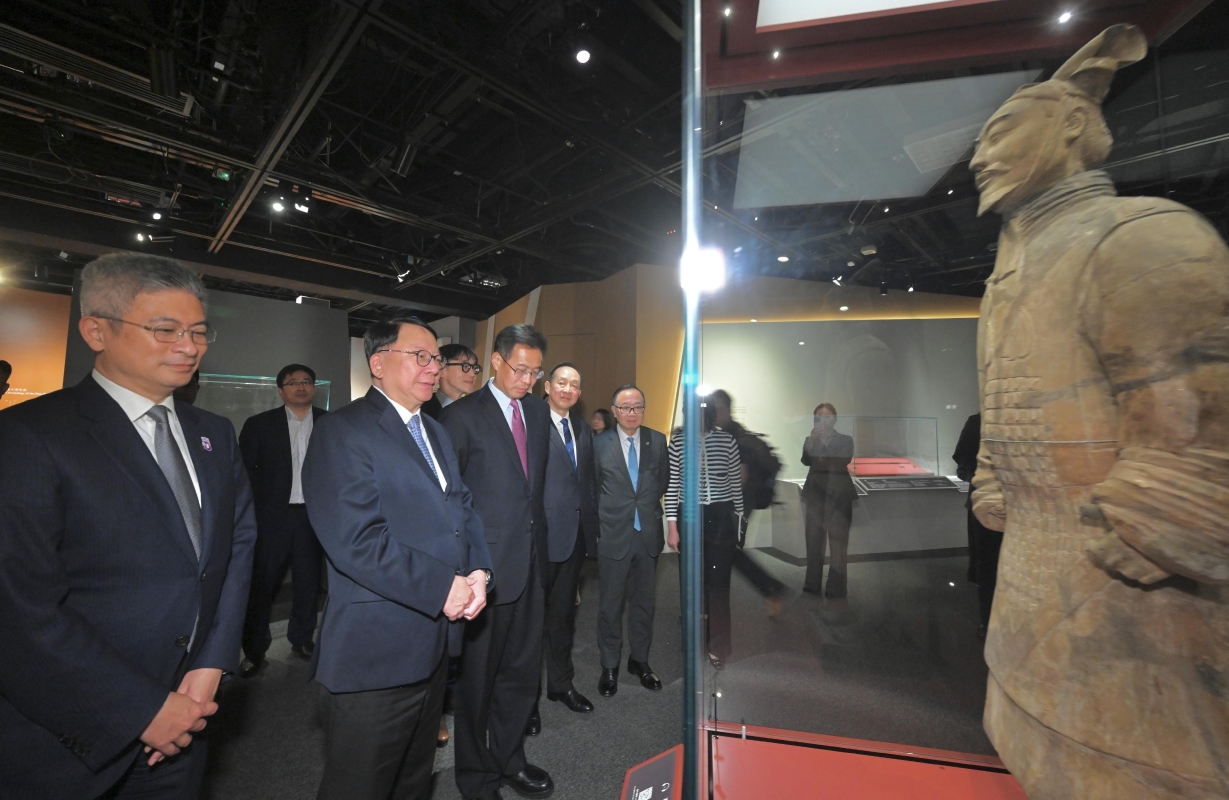 香港特區政府政務司司長陳國基今日(四月十五日)出席“香港賽馬會呈獻系列:天下一統—陝西秦漢文明展”開幕典禮。圖示陳國基(左二)參觀展覽。香港特區政府新聞處圖片 展覽精選文物包括秦始皇帝兵馬俑、漢景帝地下兵團與牲畜群像、車馬器、建築構件等,介紹秦漢時期的政治、經濟、文化、科技以及中外交通等發展,亦介紹香港在秦漢時期的發展。 當天適逢第十個中國全民國家安全教育日,特區政府政務司司長陳國基在開幕典禮上致辭指,文化是一個國家、一個民族的靈魂,文化安全關乎國家穩固、民族團結和精神傳承,是國家安全二十個重點領域之一。特區政府一直積極維護文化安全,透過強化中華優秀傳統文化,培養愛國核心價值觀,樹立民族團結精神,讓市民自覺維護國家安全。 中央人民政府駐香港特別行政區聯絡辦公室副主任祁斌、陝西省文物局副局長錢繼奎等亦出席活動。 展覽是“中國通史系列”的第二個展覽,是香港歷史博物館和弘揚中華文化辦公室協作的項目,透過順時序介紹由夏商周至現代中國的重要歷史時期,該系列第一個展覽和第一屆中華文化節廣受歡迎,共吸引超過100萬人次參與,透過祖國珍貴的歷史文化寶藏,向世界展現中華文化的獨特魅力。(完) 【編輯:馬華】