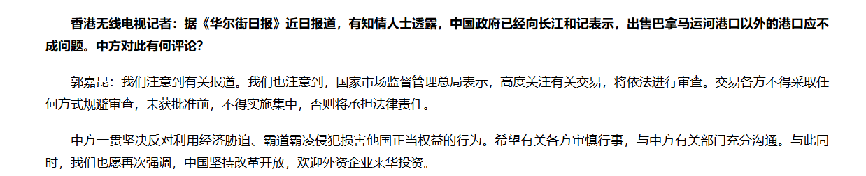 當天,香港無線電視記者提問,據《華爾街日報》近日報道,有知情人士透露,中國政府已經向長江和記表示,出售巴拿馬運河港口以外的港口應不成問題。中方對此有何評論? 郭嘉昆表示,我們注意到有關報道。我們也注意到,國家市場監督管理總局表示,高度關注有關交易,將依法進行審查。交易各方不得採取任何方式規避審查,未獲批准前,不得實施集中,否則將承擔法律責任。 中方一貫堅決反對利用經濟脅迫、霸道霸淩侵犯損害他國正當權益的行為。希望有關各方審慎行事,與中方有關部門充分溝通。與此同時,我們也願再次強調,中國堅持改革開放,歡迎外資企業來華投資。(完) 【編輯:陳卓儀】