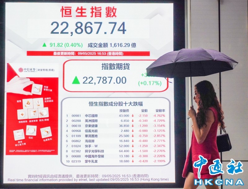 香港中通社5月9日電(記者 張明臻)市場觀望中美官員稍後會面,港股連升第七日。恆指9日收報22867點,升91點或0.4%,大市全日成交1616億港元。港股七日累升895點或4.1%。