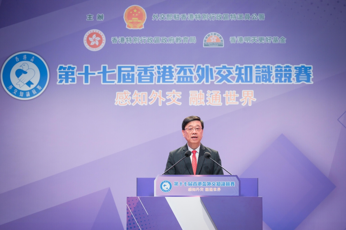 香港特區行政長官李家超5月17日在第十七屆香港盃外交知識競賽決賽暨頒獎典禮致辭。香港特區政府新聞處圖片 當天,李家超在第十七屆香港盃外交知識競賽決賽暨頒獎典禮上致辭表示,這次深化國際交往合作的訪問,展現香港和內地優勢互補協同效應力量,發揮香港“引進來、走出去”的橋樑作用,成果豐碩,為香港和內地與中東地區政商界建立了直接和長遠的關係。 李家超說,外交是國家主權的體現、連接世界的橋樑。當今世界形勢複雜多變,地緣政治風險變幻莫測,經濟和社會領域深刻變革,全球治理體系面臨前所未有的挑戰。香港是國際大都會和中西文化藝術交流中心,要積極發揮香港在“一國兩制”下內聯外通的優勢,為國家與世界交流合作貢獻香港力量。(完) 【編輯:馬華】