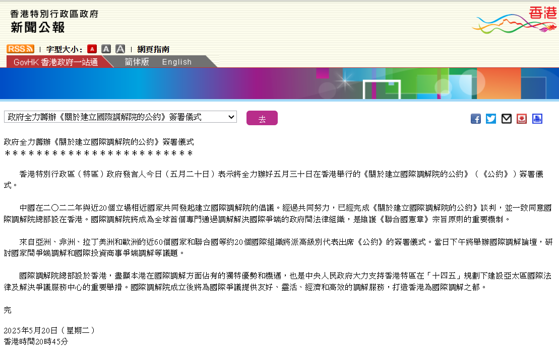 香港新聞網5月20日電 香港特別行政區政府發言人20日表示,將全力辦好30日在香港舉行的《關於建立國際調解院的公約》(《公約》)簽署儀式。 中國在2022年與近20個立場相近國家共同發起建立國際調解院的倡議。經過共同努力,已經完成《關於建立國際調解院的公約》談判,並一致同意國際調解院總部設在香港。國際調解院將成為全球首個專門通過調解解決國際爭端的政府間法律組織,是維護《聯合國憲章》宗旨原則的重要機制。