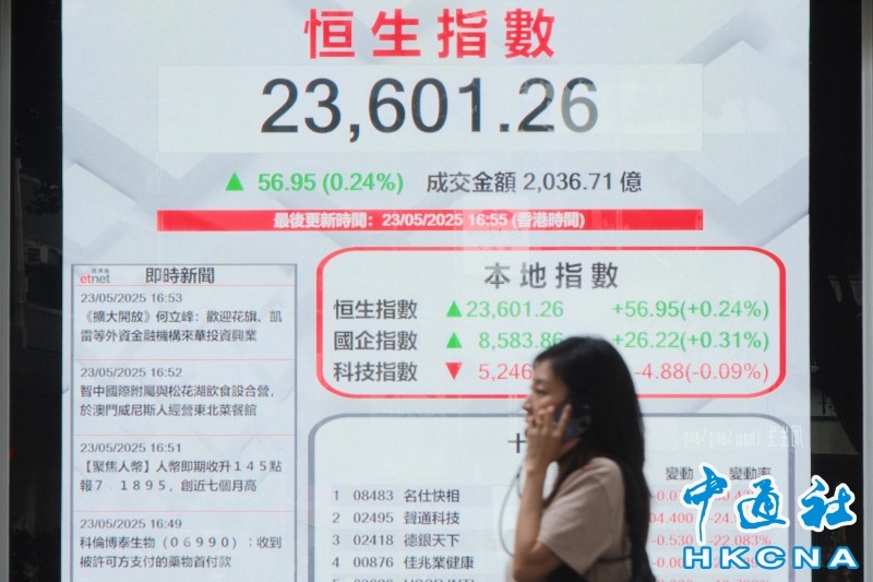 香港中通社5月23日電(記者 譚暢)港股23日表現反覆,恒生指數當日升56點或0.2%,報23601點;大市全日成交約2036.7億港元。恒指連升六周,本周升256點或1.1%。