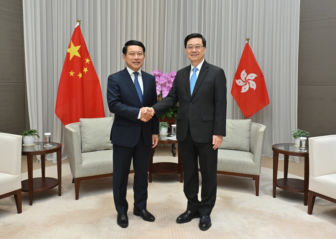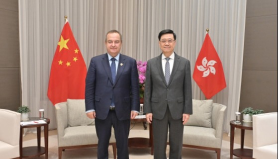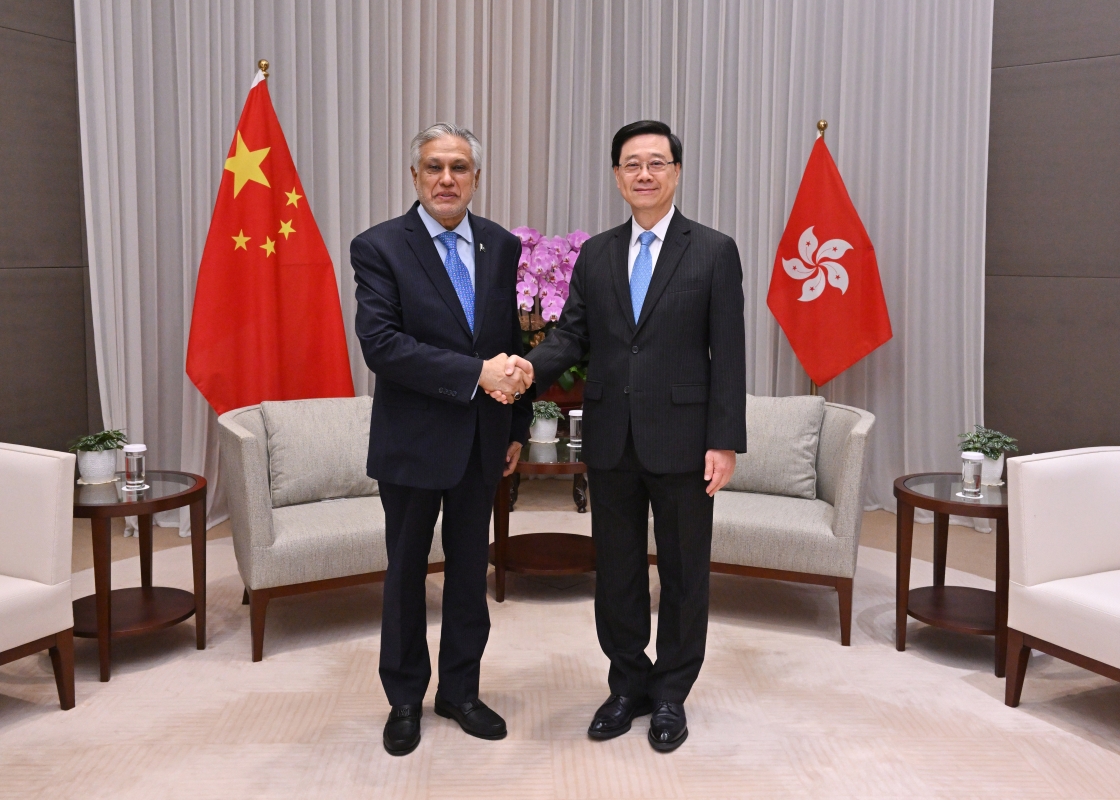 行政長官李家超(右)與巴基斯坦副總理兼外長達爾(左)會面。圖源:行政長官辦公室