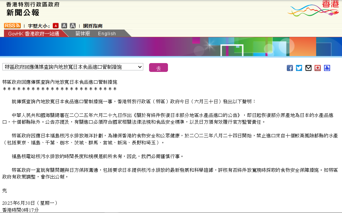聲明指,中華人民共和國海關總署在2025年6月29日作出《關於有條件恢復日本部分地區水產品進口的公告》,即日起恢復部分原產地為日本的水產品進口,十個都縣除外。公告亦提及,有關進口必須符合國家相關法律法規和食品安全標準,以及日方須有效履行官方監管責任。 特區政府因應日本福島核污水排放海洋計劃,為確保香港的食物安全和公眾健康,於2023年8月24日開始,禁止進口來自十個較高風險都縣的水產(包括東京、福島、千葉、栃木、茨城、群馬、宮城、新潟、長野和埼玉)。 特區政府一直就有關問題與日方保持溝通,包括要求日本提供核污水排放的最新發展和科學證據,評核有否條件放寛現時採取的食物安全保障措施。如特區政府有政策調整,會作出公報。(完) 【編輯:譚暢】