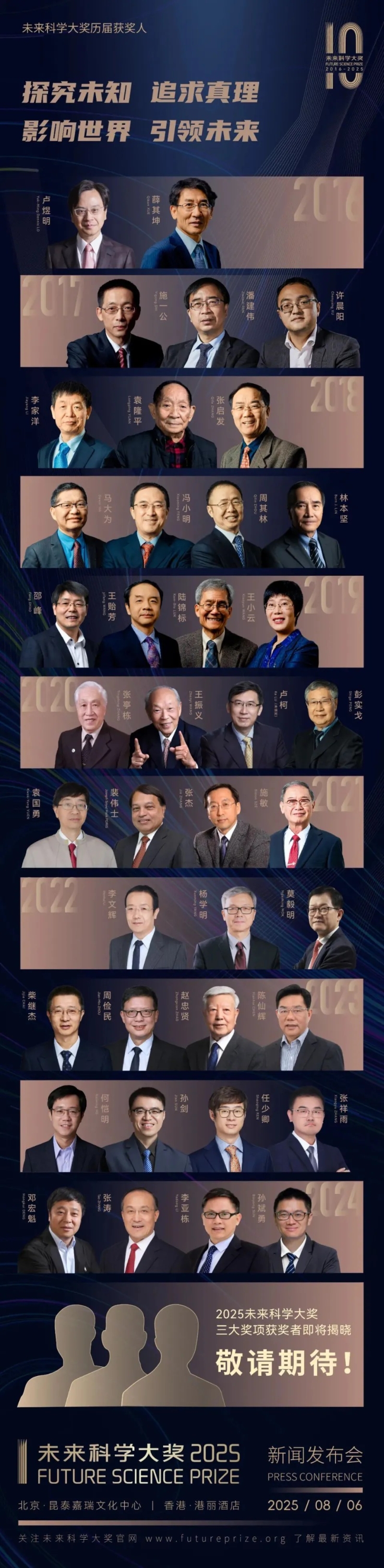真格基金聯合創始人王強(左)是未來科學大獎捐贈人之一 真格基金聯合創始人、未來科學大獎捐贈人王強表示,大獎周自2023年起在香港舉行,兩年超7萬人現場參與,全球2500萬人次線上觀看,去年展覽更是吸引了香港及大灣區的公眾近7萬人前來打卡參觀。隨著基礎研究突破不斷湧現,科技體制改革深化推進,我們已迎來創新驅動的黃金時代。 大獎周活動將有近一百位國際級科學家參加,包括四位諾貝爾獎學者:2013年諾貝爾生理學或醫學獎得主RandySchekman、2013年諾貝爾化學獎得主Arieh Warshel、2020年及2004年諾貝爾物理學獎得主Reinhard Genzel及David Gross,以及十多位來自中國科學院、美國國家科學院、歐洲科學院等機構的院士。 未來科學大獎由香港未來科學大獎基金會於2016年設立,是由科學家和企業家群體共同發起的民間科學獎項,旨在獎勵在中國內地、香港、澳門和台灣地區取得傑出科學成果的科學家,激發科學精神,喚起科學熱情,吸引更多青年投身於科學事業。 未來科學大獎設有生命科學獎、物質科學獎、數學與計算機科學獎三大獎項,單項獎金為100萬美元,被國際科學雜誌《Nature》譽為“中國的諾貝爾獎”。 2025年為未來科學大獎十周年誌慶,活動已連續四年在香港舉辦。