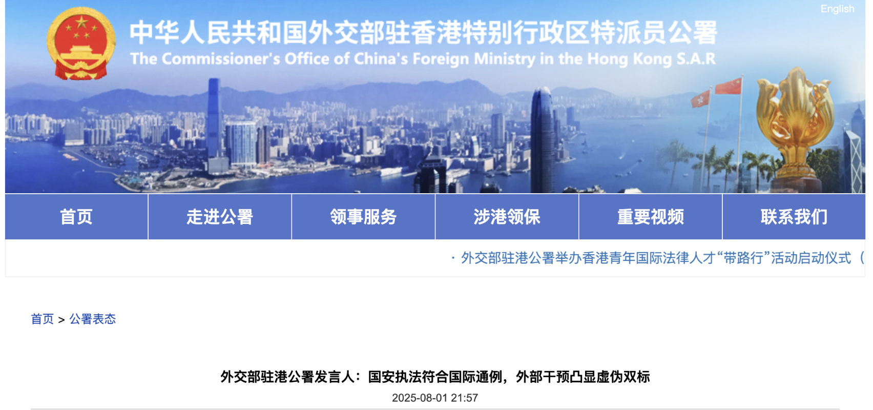 外交部駐港公署發言人:國安執法符合國際通例,外部干預凸顯虛偽雙標分享到: