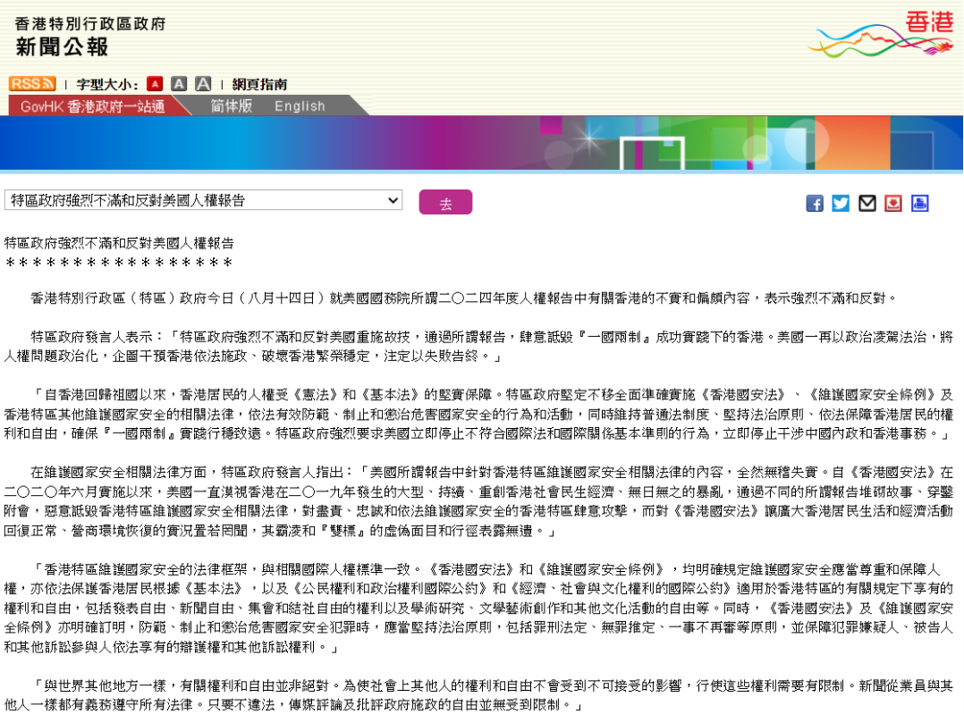 “自香港回歸祖國以來,香港居民的人權受憲法和基本法的堅實保障。特區政府堅定不移全面準確實施香港國安法、《維護國家安全條例》及香港特區其他維護國家安全的相關法律,依法有效防範、制止和懲治危害國家安全的行為和活動,同時維持普通法制度、堅持法治原則、依法保障香港居民的權利和自由,確保『一國兩制』實踐行穩致遠。特區政府強烈要求美國立即停止不符合國際法和國際關係基本準則的行為,立即停止干涉中國內政和香港事務。” 在維護國家安全相關法律方面,特區政府發言人指出:“美國所謂報告中針對香港特區維護國家安全相關法律的內容,全然無稽失實。自香港國安法在2020年6月實施以來,美國一直漠視香港在2019年發生的大型、持續、重創香港社會民生經濟、無日無之的暴亂,通過不同的所謂報告堆砌故事、穿鑿附會,惡意詆毀香港特區維護國家安全相關法律,對盡責、忠誠和依法維護國家安全的香港特區肆意攻擊,而對香港國安法讓廣大香港居民生活和經濟活動回復正常、營商環境恢復的實況置若罔聞,其霸凌和『雙標』的虛偽面目和行徑表露無遺。” “香港特區維護國家安全的法律框架,與相關國際人權標準一致。香港國安法和《維護國家安全條例》,均明確規定維護國家安全應當尊重和保障人權,亦依法保護香港居民根據基本法,以及《公民權利和政治權利國際公約》和《經濟、社會與文化權利的國際公約》適用於香港特區的有關規定下享有的權利和自由,包括發表自由、新聞自由、集會和結社自由的權利以及學術研究、文學藝術創作和其他文化活動的自由等。同時,香港國安法及《維護國家安全條例》亦明確訂明,防範、制止和懲治危害國家安全犯罪時,應當堅持法治原則,包括罪刑法定、無罪推定、一事不再審等原則,並保障犯罪嫌疑人、被告人和其他訴訟參與人依法享有的辯護權和其他訴訟權利。” “與世界其他地方一樣,有關權利和自由並非絕對。為使社會上其他人的權利和自由不會受到不可接受的影響,行使這些權利需要有限制。新聞從業員與其他人一樣都有義務遵守所有法律。只要不違法,傳媒評論及批評政府施政的自由並無受到限制。” “香港國安法和《維護國家安全條例》訂明的危害國家安全的罪行,精準針對危害國家安全的行為,清楚訂明構成有關罪行的元素和刑罰。控方有責任在毫無合理疑點下證明被告人有相關的犯罪行為和犯罪意圖,被告人才可被法庭定罪。此外,相關罪行不會有追溯力,符合《香港人權法案》第12條的規定。” “事實上,每個主權國都會制定維護國家安全法律,這既是主權國家的固有權利,也是國際慣例。在維護國家安全方面的法律,美國就最少有21部,根本沒有資格對其他國家和地區就正當維護國家安全立法指手畫腳。” “合理和正當地基於客觀事實發表的言論和正當的日常活動,不會構成罪行。不論是香港國安法下的罪行,抑或是香港特區法律下的其他危害國家安全罪行,都只是針對極少部分的危害國家安全的組織和個人。” 至於執法工作方面,特區政府發言人重申:“香港特區執法部門根據證據、嚴格依照法律,以及按有關個人或單位的行為採取所有執法行動,與政治立場、背景或職業無關。” “與世界上其他執法部門一樣,香港特區執法部門公開因涉嫌犯下嚴重罪行而被通緝的逃犯資料,並要求市民大眾協助緝拿逃犯歸案,有關做法合法和實屬必要,亦符合國際慣例。美國經常對別國公民濫施『長臂管轄』、單邊制裁,其對香港特區依法進行執法行動的抹黑,根本站不住腳。” “就保釋安排而言,維護國家安全,以及防範和制止危害國家安全的行為極為重要,此解釋了為何香港國安法對涉及危害國家安全的罪行引入更嚴格的保釋條件。有一些司法管轄區甚至設有機制,可以國家安全為由,因應案件的具體情況准許未經起訴而長時間拘留。美國所謂報告中針對有關安排實施的內容屬無理抹黑。” 在維護司法公正和法治精神方面,特區政府發言人重申:“香港是法治社會,一直秉持有法必依、違法必究的原則。香港特區司法制度深得國際社會推崇。香港特區司法機關依法獨立進行審判,不受任何干涉,而所有面對刑事指控的人都享有接受公平審訊的權利。” 就美國所謂報告中有關懲教院所情況的不實內容,特區政府發言人表示:“懲教署致力為在囚人士提供穩妥、安全、人道、合適和健康的羈管環境。獨立訪客(即太平紳士)定期巡視的安排確保在囚人士的權利獲得保障,太平紳士獲賦予每月巡視監獄一次或兩次的法定職責。在囚人士可向巡獄太平紳士或循其他途徑作出申訴,包括懲教署投訴調查組、申訴專員公署等。所有在囚人士作出的投訴都會獲公平、公開和公正的處理。” “為某囚犯的利益或為維持秩序或紀律,懲教署署長根據《監獄規例》第68B條可作出有關囚犯不應與其他囚犯交往的安排(即所謂的“單獨監禁”)。有關安排的其中一個目的是保障囚犯的人身安全和福祉,可由該囚犯自行提出要求、由懲教署署長依法考慮後審批,或由懲教署署長根據法律規定及程序,在考量了相關的因素後而作出。” 就美國所謂報告中有關遣送政策的不實內容,特區政府發言人表示:“特區政府一貫採取堅定政策,不會給予任何人庇護,亦不會決定或確認任何人為難民。已實
