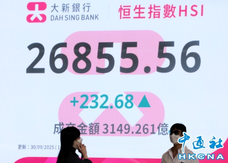 香港中通社9月30日電(記者 徐嘉儀)9月30日是港股季結日,個別科技股獲資金追捧,帶動大市升勢,恒生指數收市報26855點,升232點。大市成交額為3149億港元。總結9月,恒指累升逾7%;第三季,恒指累升近12%;今年首三季,累升逾三成。